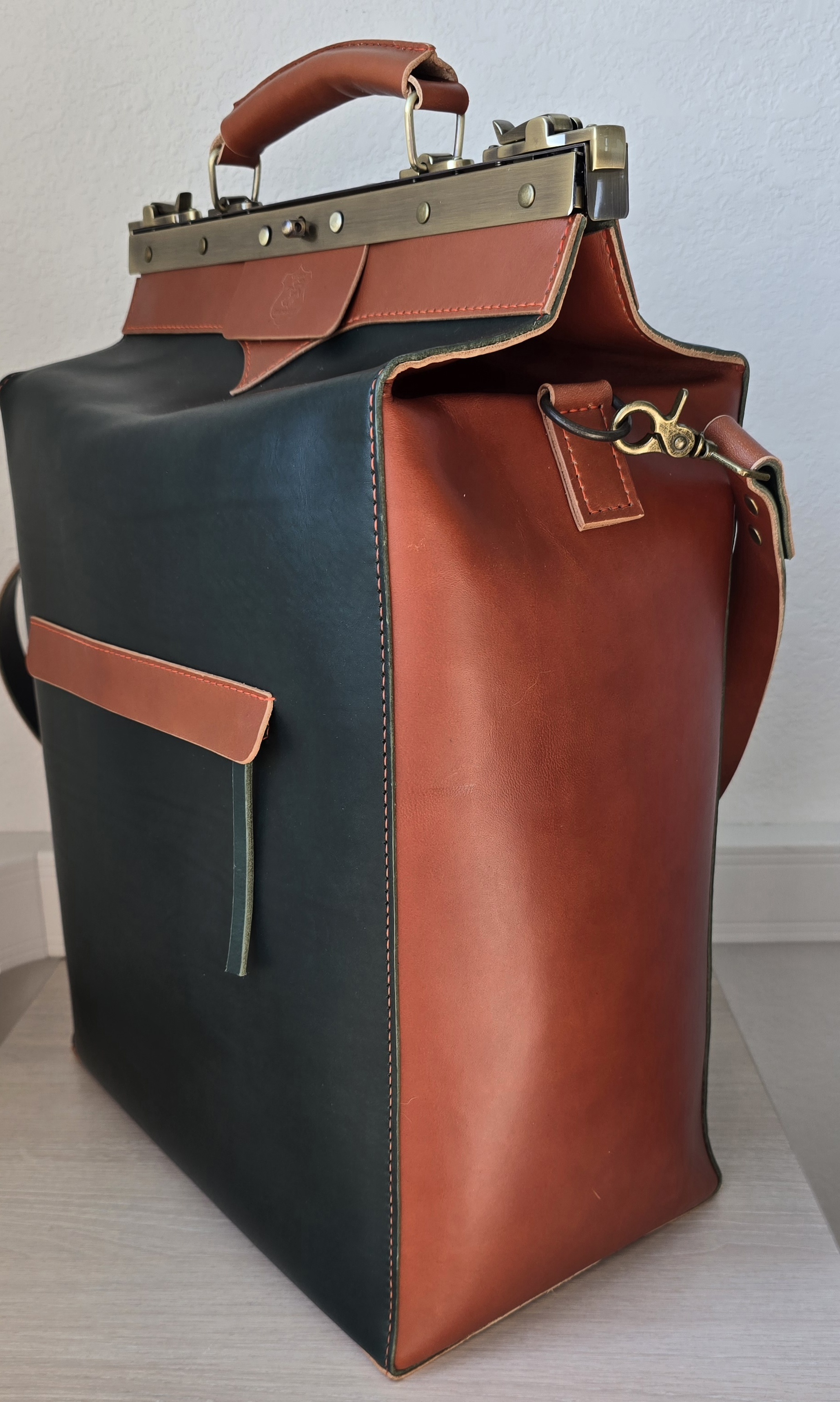 Не так давно сшили вместе с супругой довольно таки нелёгкий заказ - дорожный саквояж. Почему нелёгкий? Потому что нестандартный размер, длинные и неудобные швы, самым неудобным был последний шов, который шился практически вслепую, так как он был завершающий, а слои кожи на все саквояже накладывались "изнанка на лицо" (это я такой термин для себя придумал).