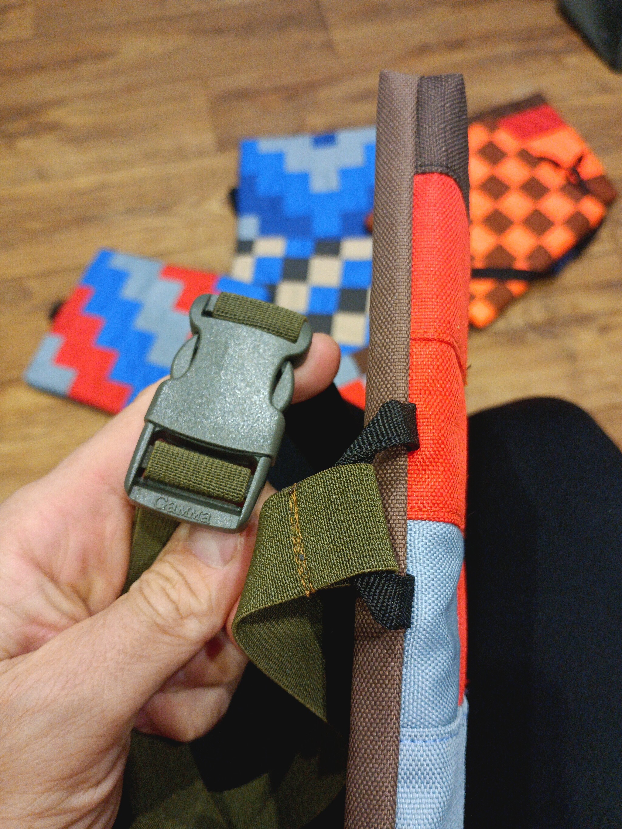 То, что на первом фото - готовое, с прошлого сезона лежит. Далее - заготовки, ждущие свободного времени. И ещё коробка готовых квадратиков и ящик обрезков. Иногда просят в цвет комбеза или рюкзака. В основном туристы-походники, иногда сноубордисты.