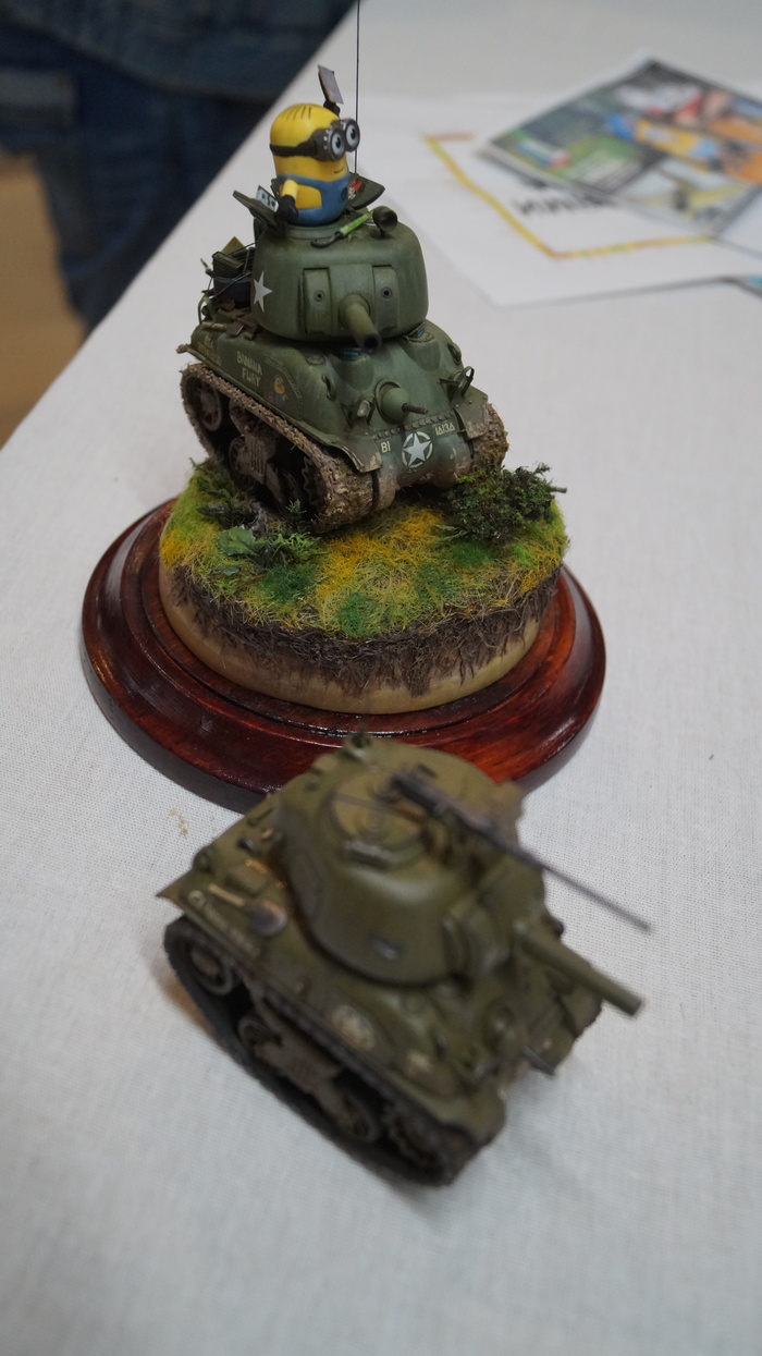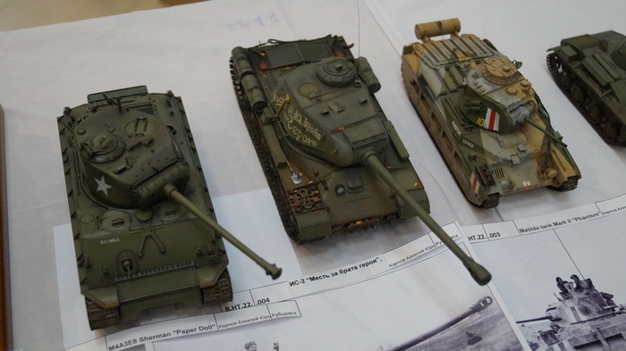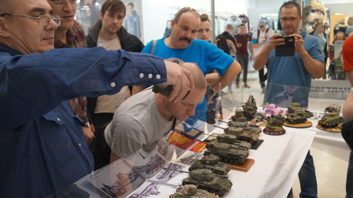 Александр Калашник, опытный моделист, пользуется судейскими привелегиями - распускает руки. Алексея Сидорова заинтересовал мой Шерман - получил порцию комплиментов. Приятно.