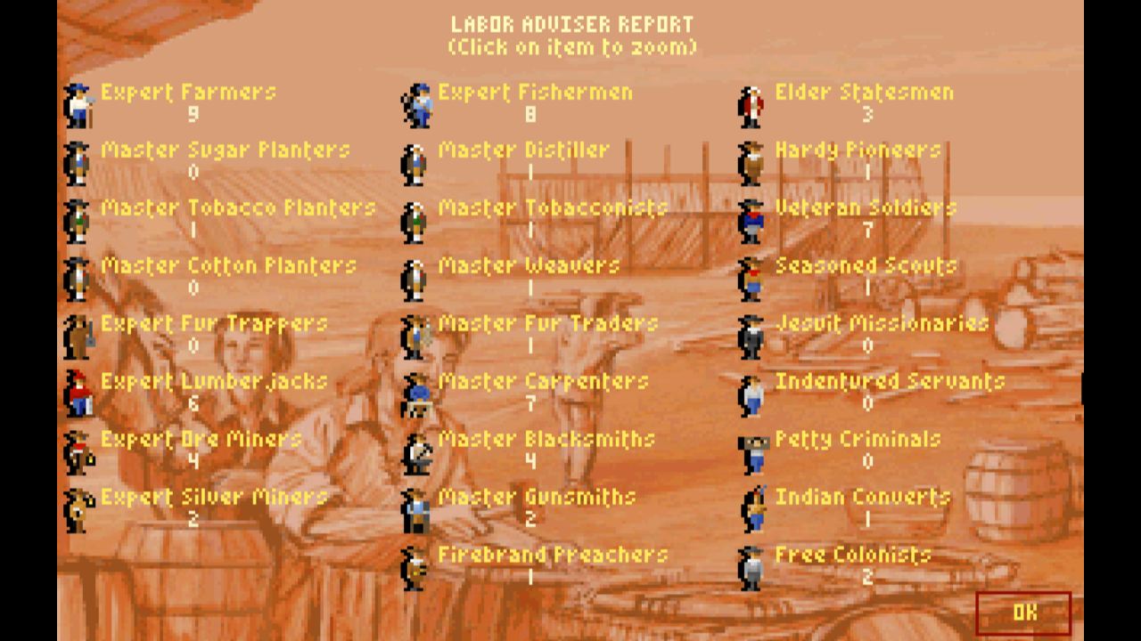 Каждый колонист может обладать профессией, что делает его более эффективным в выполнении определённых работ - от рыболовов и фермеров, до профессиональных политиков и военных.