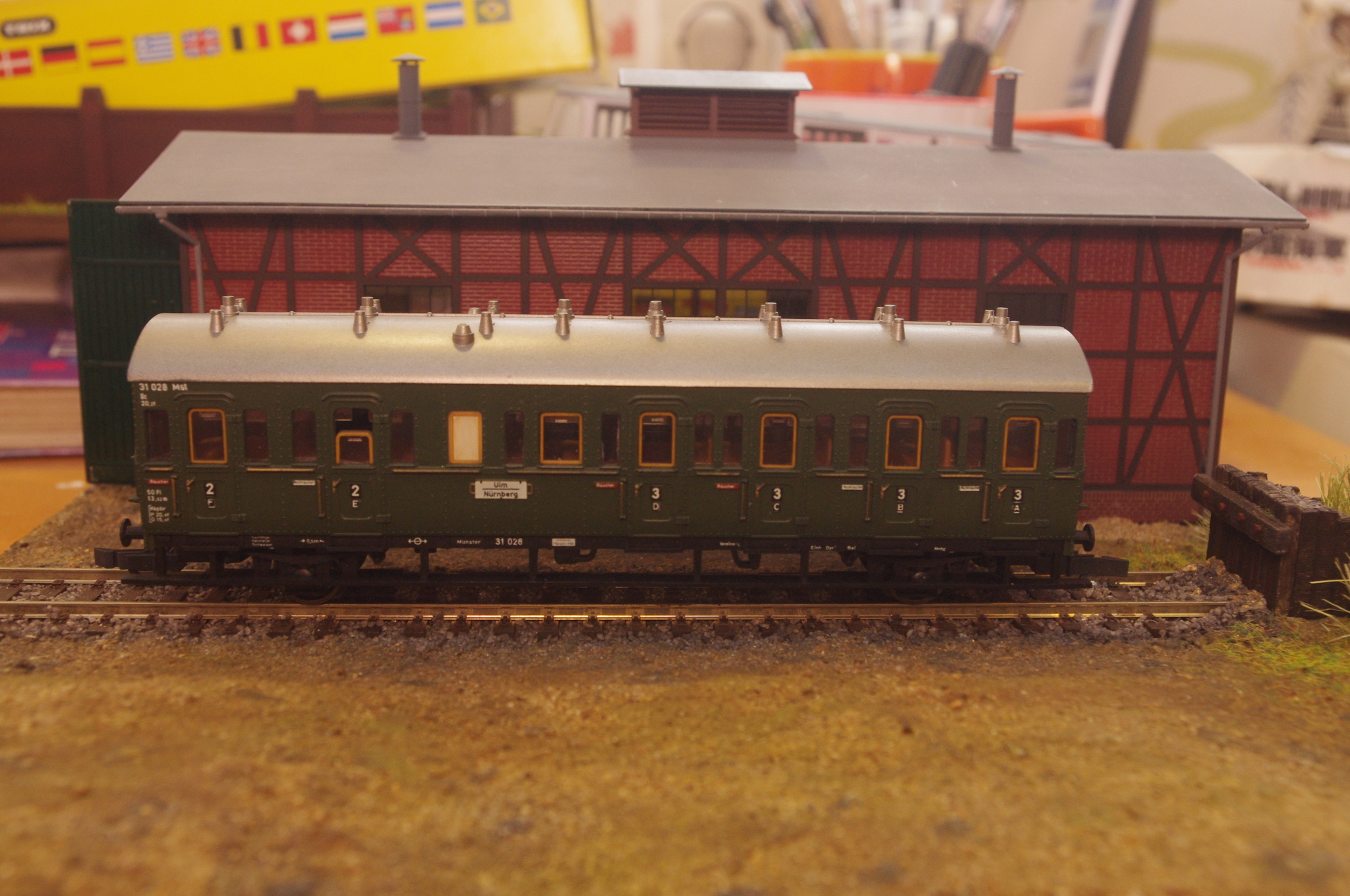 Состав т.н. abteilwagen, по нашему купейных вагонов и почтового вагона. Корректен исторически, но кривоват геометрически :) Моделям примерно 45 лет и в чертежи они немножко не помещаются. Хотя впечатление передают на все 100%.