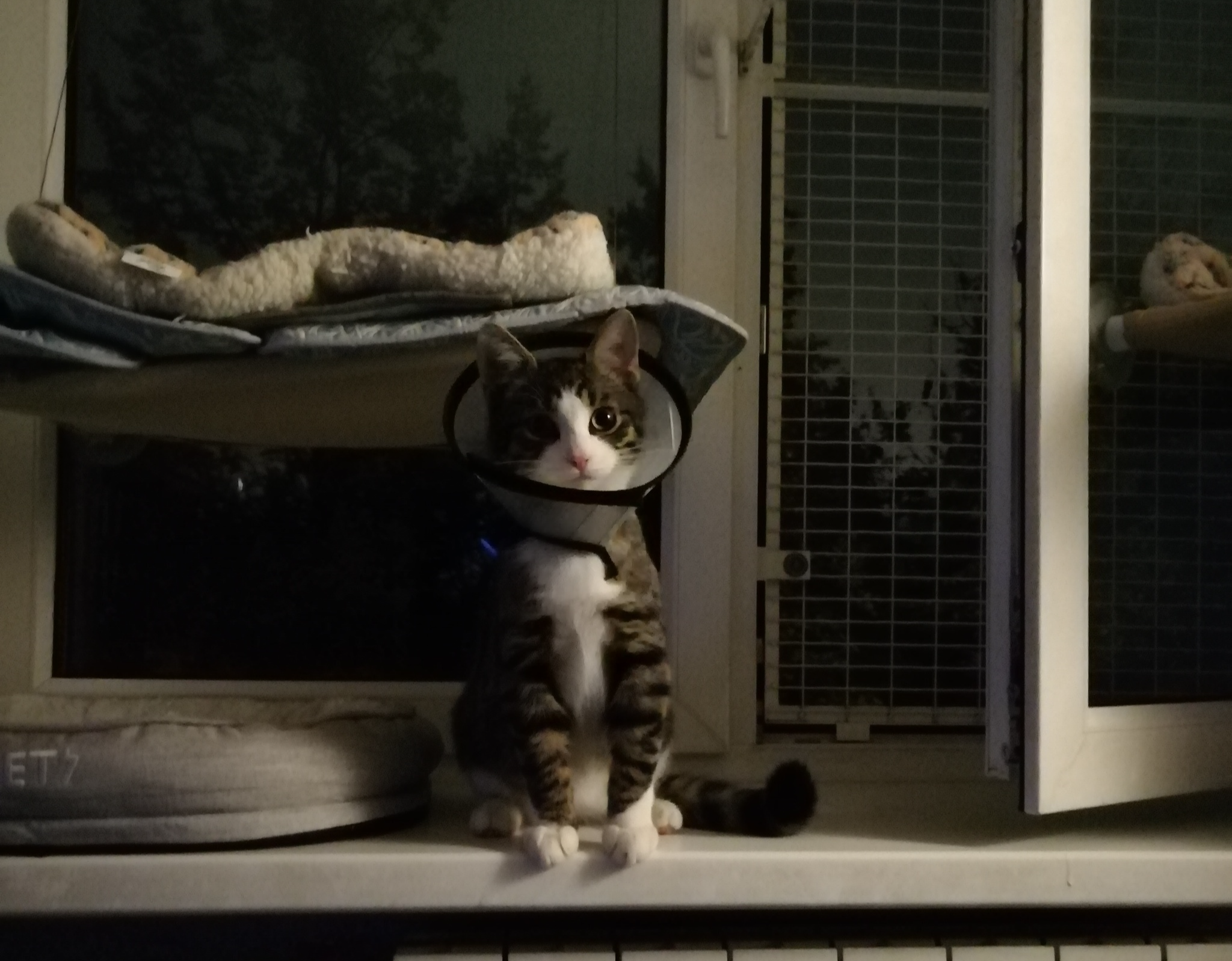 Четыре дня у нас этот космонавт пугает кошек в квартире. Настал тот момент, когда пришло время сделать чики-брики кокушкам - и вот. Он, как ни странно, адекватно к воротнику отнёсся, а вот кошки, особенно старшая - это что-то. Мы уже за её здоровье переживаем: на стрессе вся, не понимает, что ЭТО ему на голову приделали. По квартире передвигается ползком, прячется от него где только может. Плохо кушает на панике.