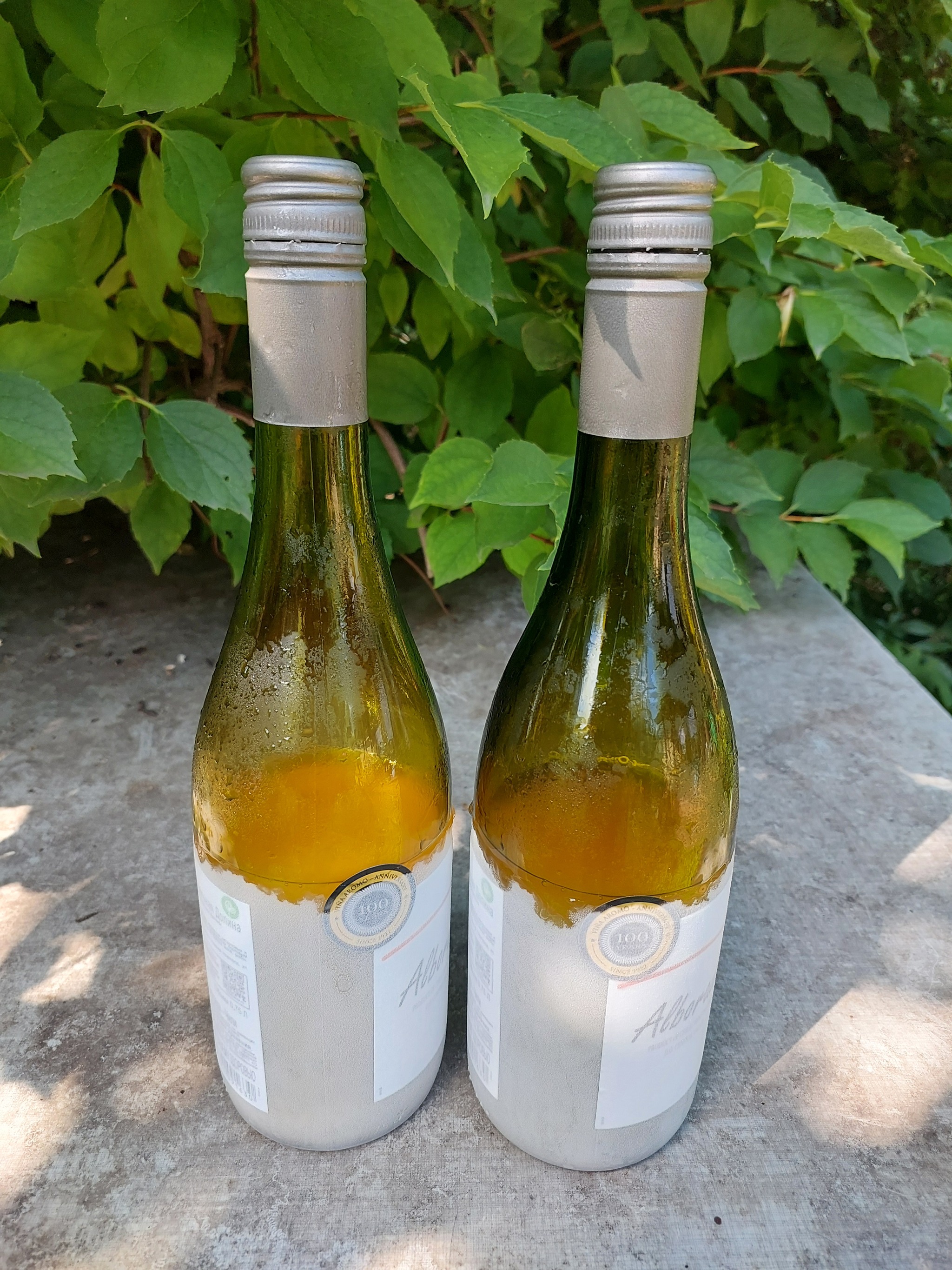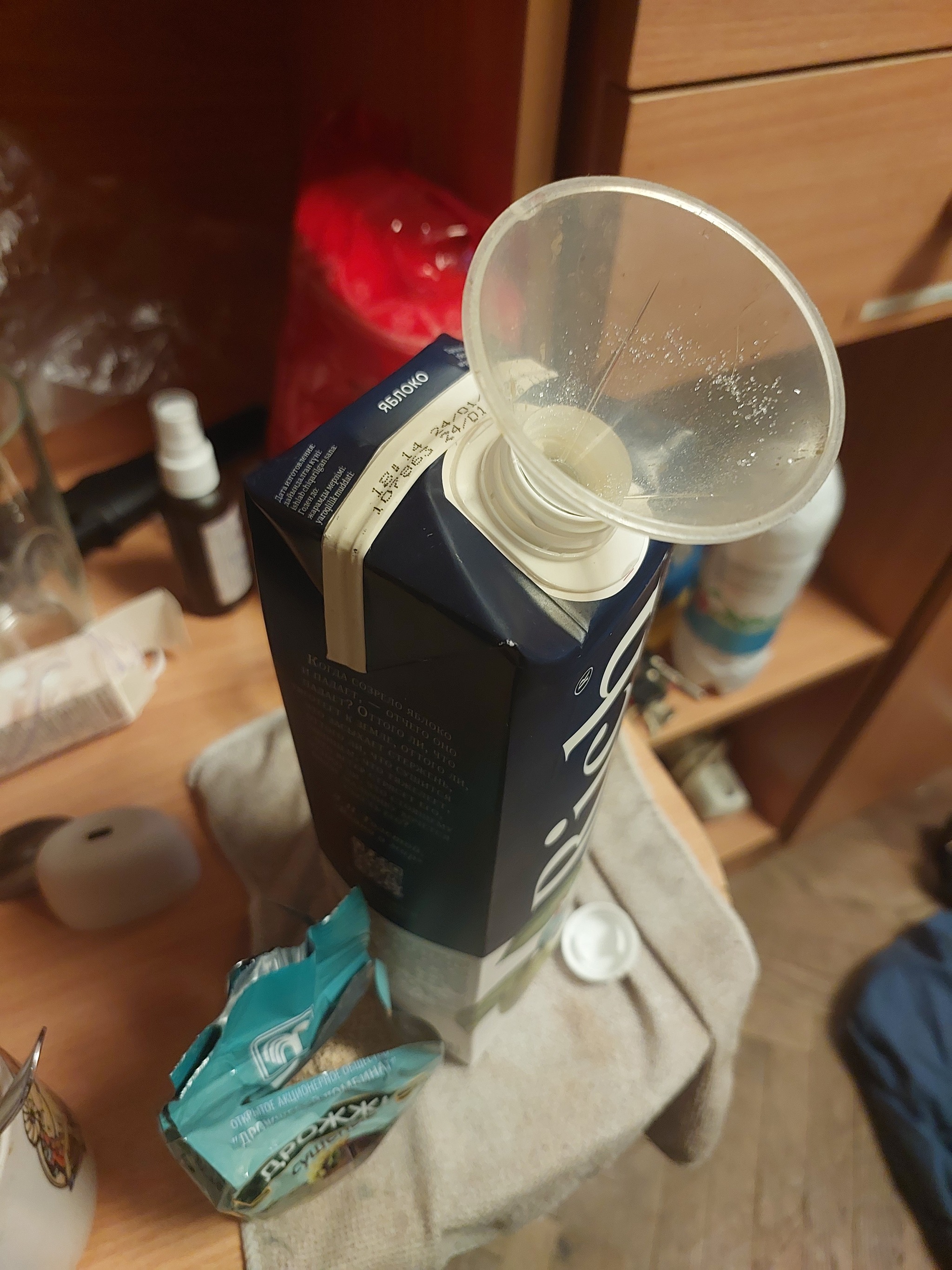 В общем, я взял свою яблочную брагу, процедил через салфетку из микрофибры и разлил в 2 бутылки из-под ноунеймового вина. Объём пачки сока 1 литр, каждая из бутылок по 0,7. Итого в бутылке 0,5/0,7 браги. Оставшиеся 0,2 - в запас на случай детской неожиданности.