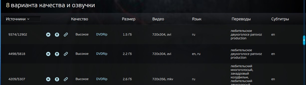 Далее можно выбрать любой формат, озвучку. Скачать или запустить сразу онлайн просмотр, не дожидаясь полной закачки.