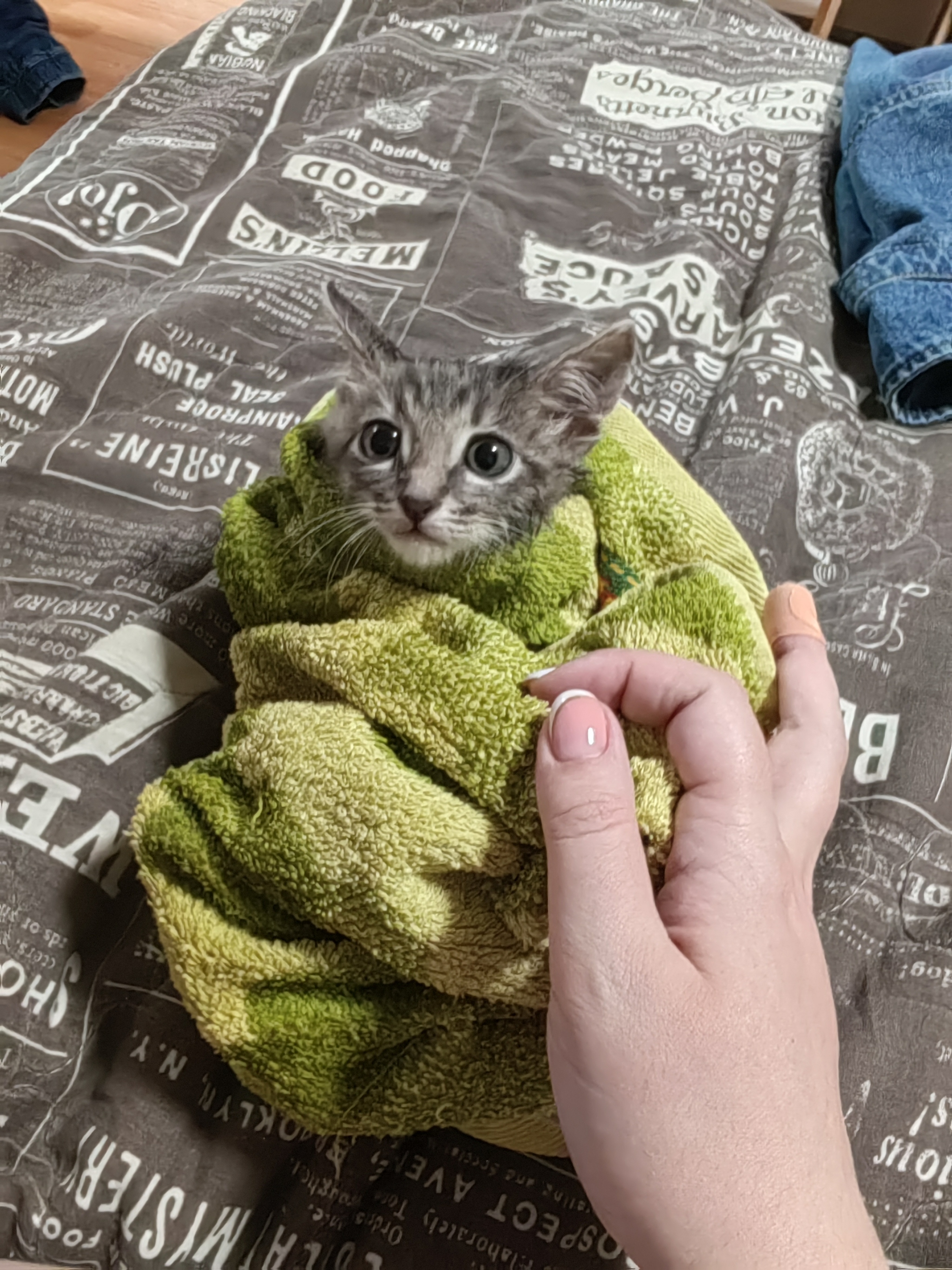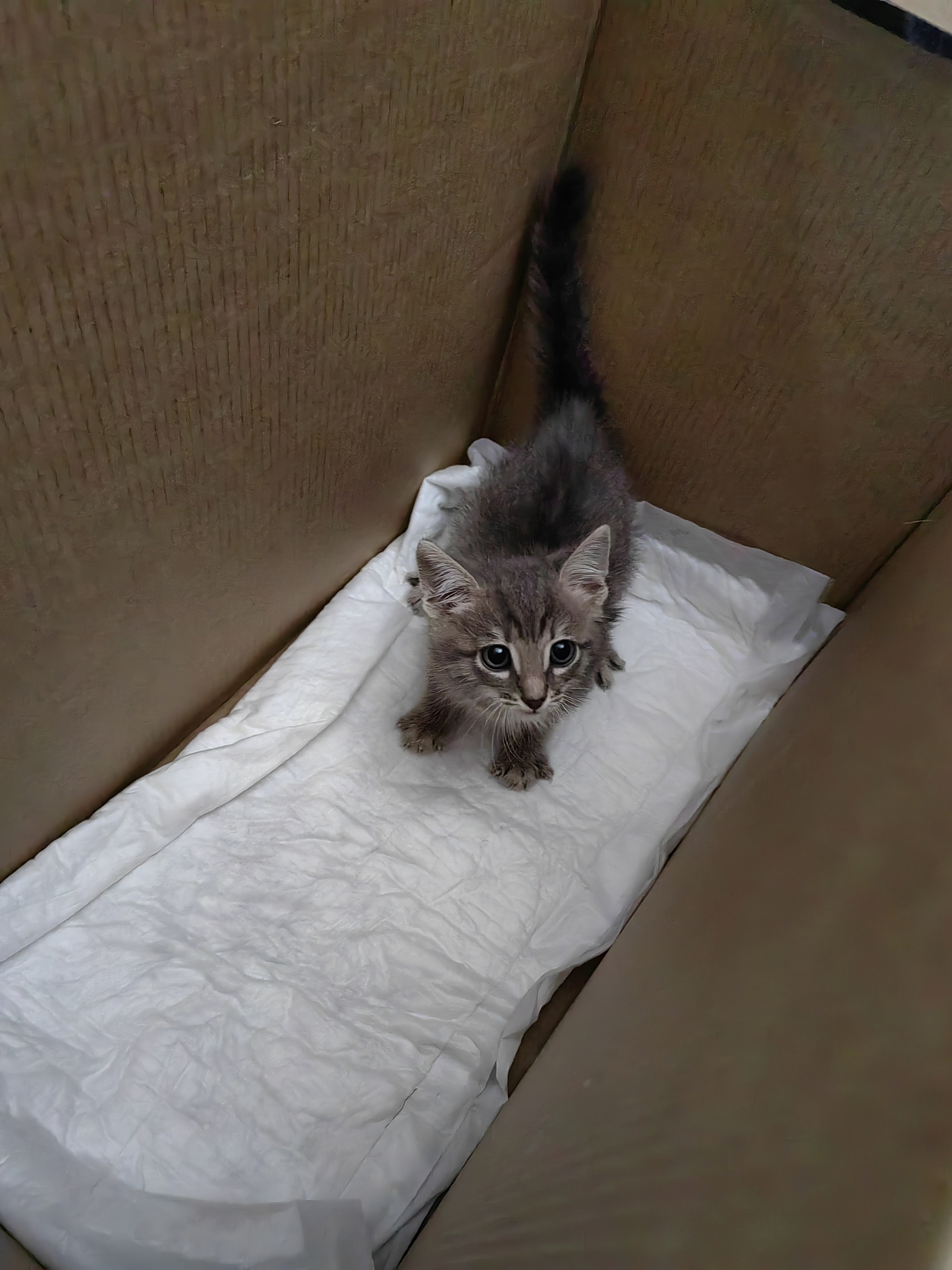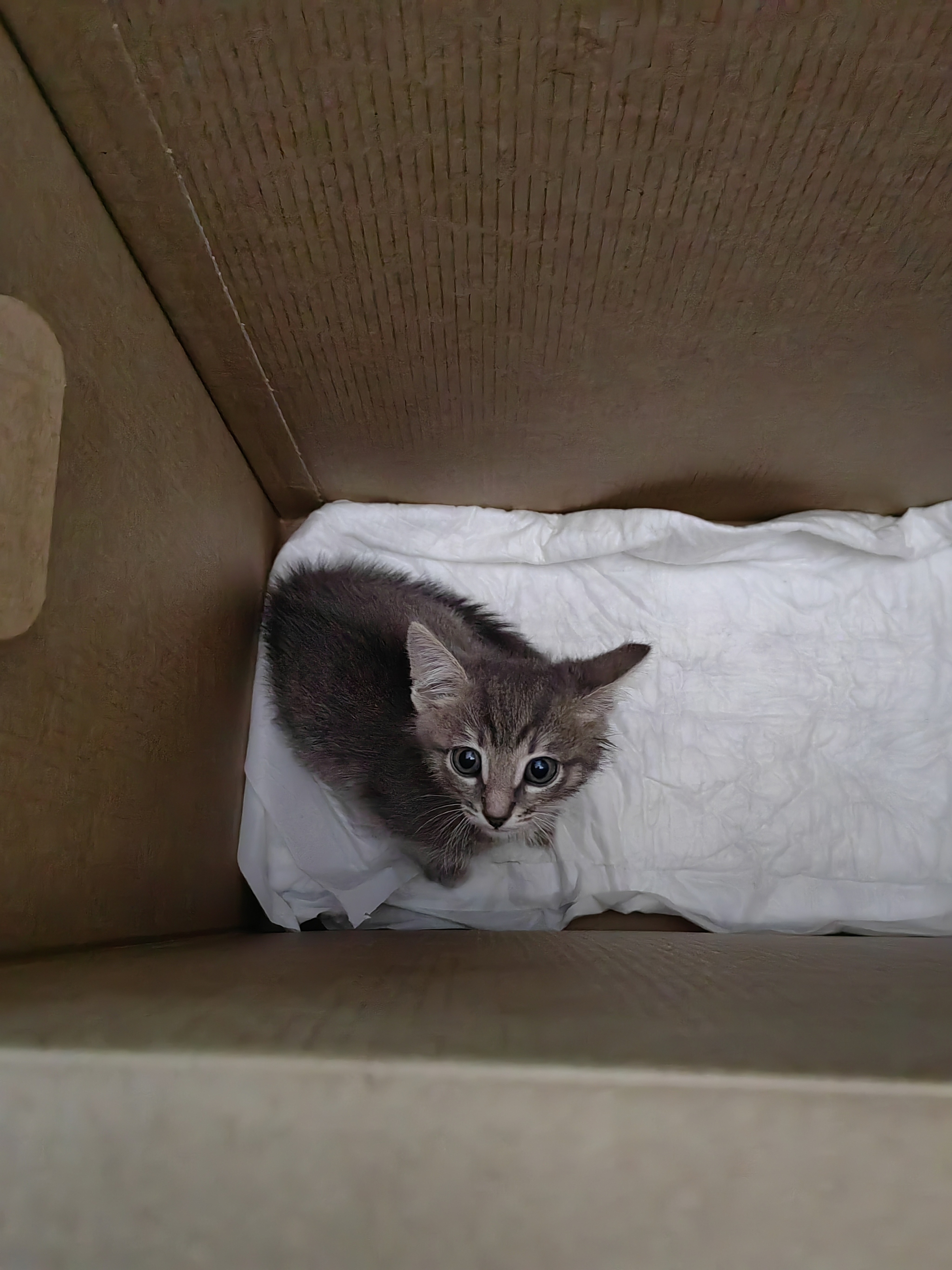 Подбросили в подъезд котёнка... Пацан, на вид здоров, блох не видно. Упитан и бодр. Оставить не могу, к сожалению, и так в однушке две кошки и ребёнок.