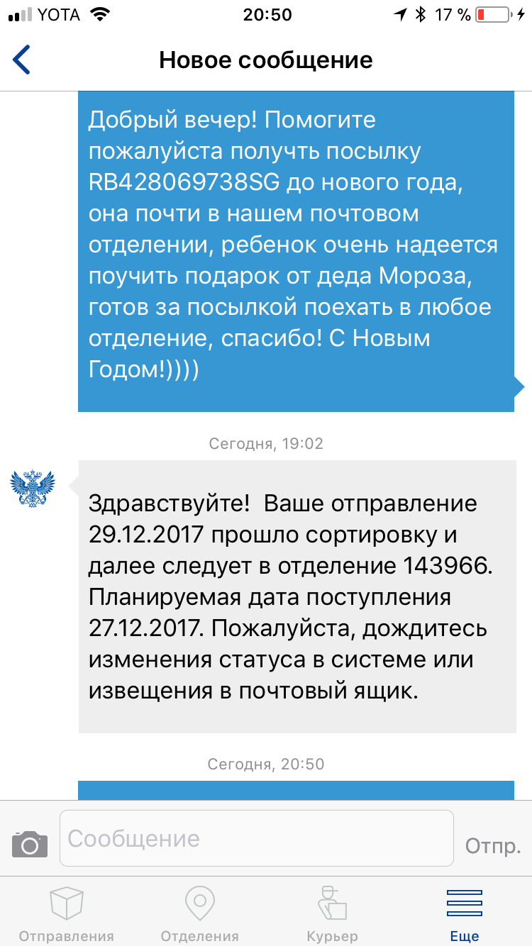 Привет Всем! Нужна Ваша помощь, в особенности @DmitriyMarkin, мое дитятко очень верит в Деда Мороза и ждет от него очень желанный подарок, но олени, на которых едет подарок застряли в Балашихе и никак не доедут до Реутова, давайте все вместе сделаем чудо, поеду за подарком хоть на край света! @DmitriyMarkin, номер Оленьей повозки RB428069738SG спасибо!))