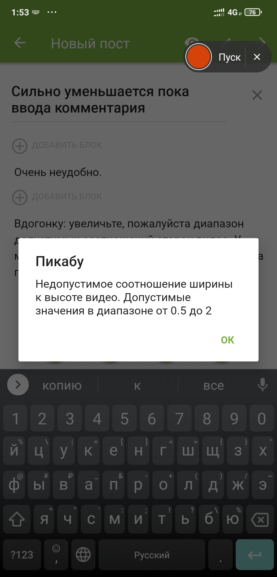 Вдогонку: увеличьте, пожалуйста диапазон допустимых соотношений сторон видео. У меня вот телефон 21:9 и видеозапись с экрана просто так не приложить
