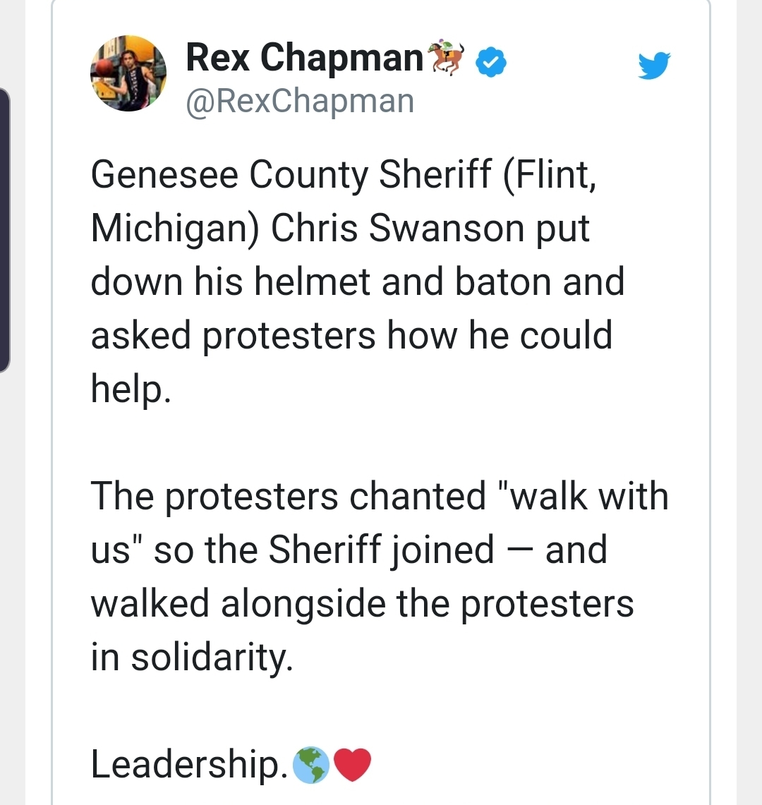 Так, в городе Флинт (штат Мичиган) несколько сотен жителей устроили марш против полицейского насилия и расовой ненависти. У департамента полиции их встретили силовики в защитном облачении. К протестующим вышел шериф округа Дженеси Крис Суонсон: он снял защиту и положил на землю дубинку, обозначив мирные намерения, и спросил, чем может помочь. Участники акции предложили ему "пройтись с ними", и он согласился. В итоге марш закончился мирно.