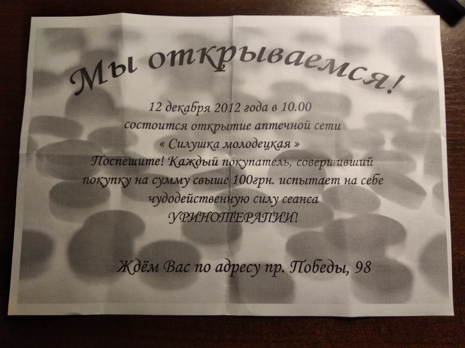 10 boogieusa "Силушка молодецкая" 7 лет назад Друг копался на работе в бумажках и нашел вот такое старенькое объявление. Объявление Уринотерапия Юмор Медицина
