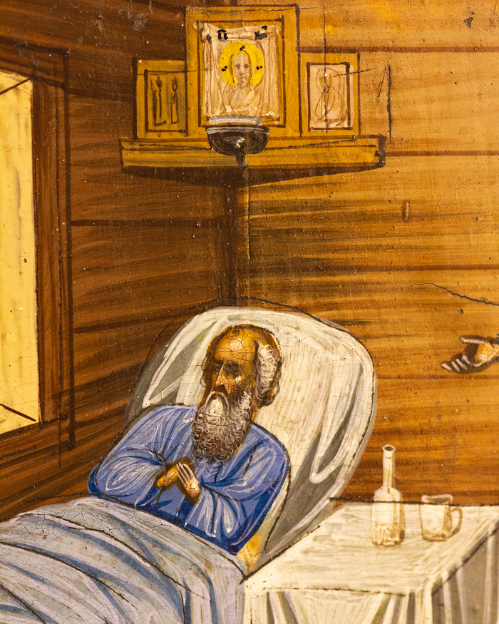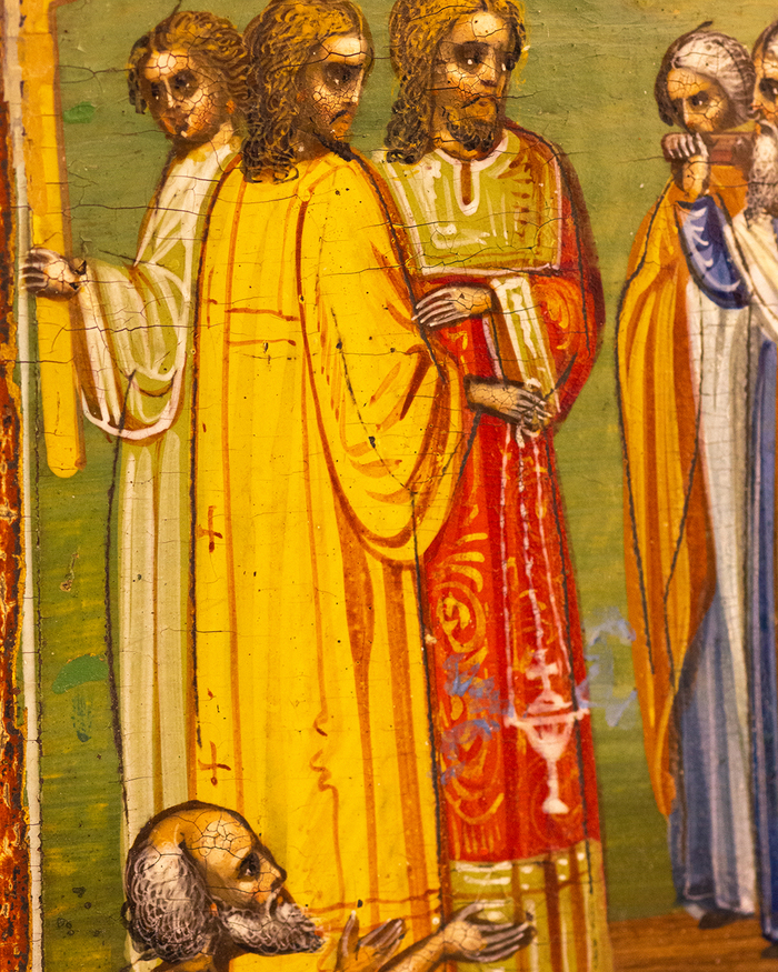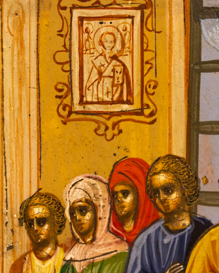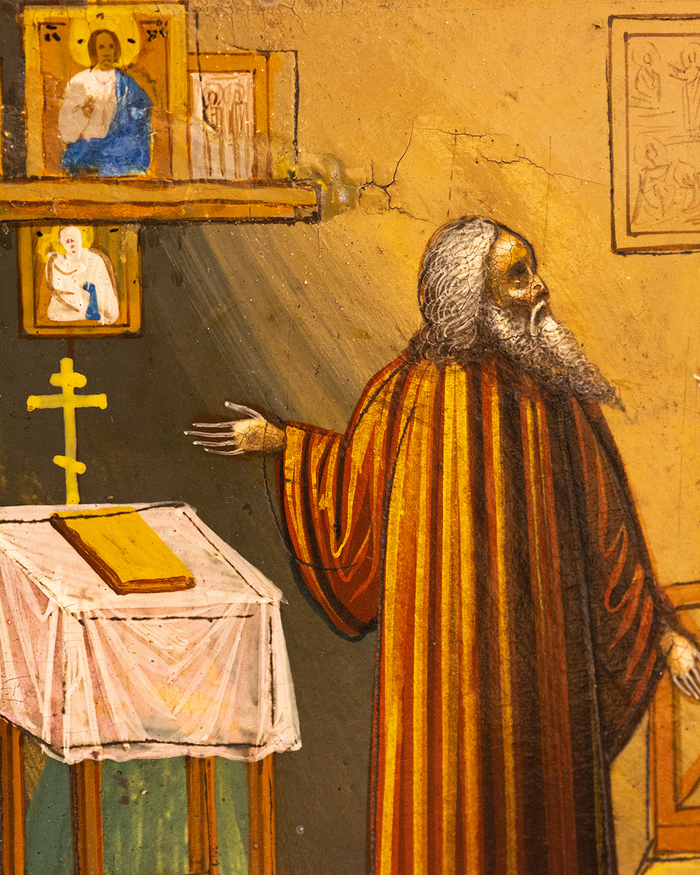 Эта большая житийная икона совершенно точно описывает и окружающую природу, и интерьер Крестовоздвиженского собора Никольского монастыря. При советской власти там была трудовая колония НКВД для несовершеннолетних преступников.