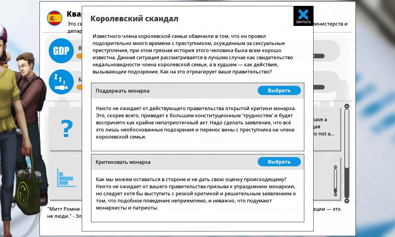 Следующий момент геймплея, это принятие решений. Вам как главе государства приносят отчёт, а также предлагают выбрать из двух вариантов один