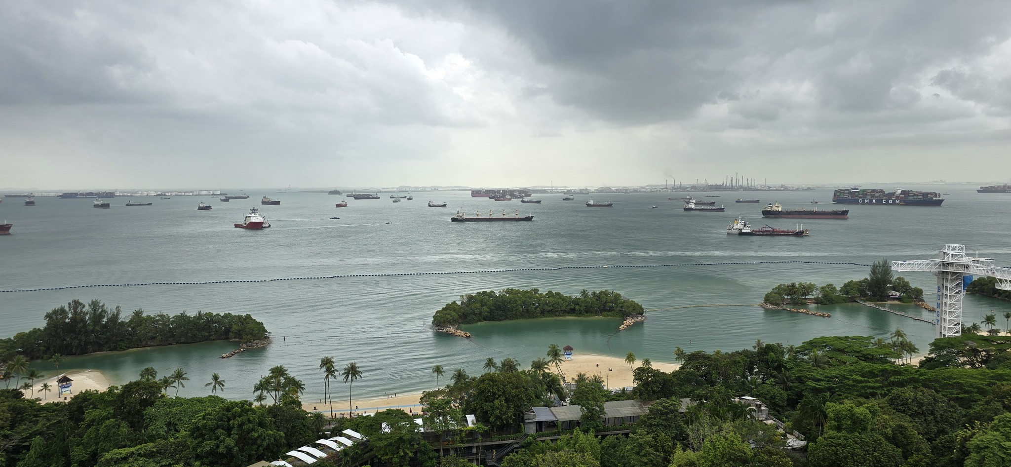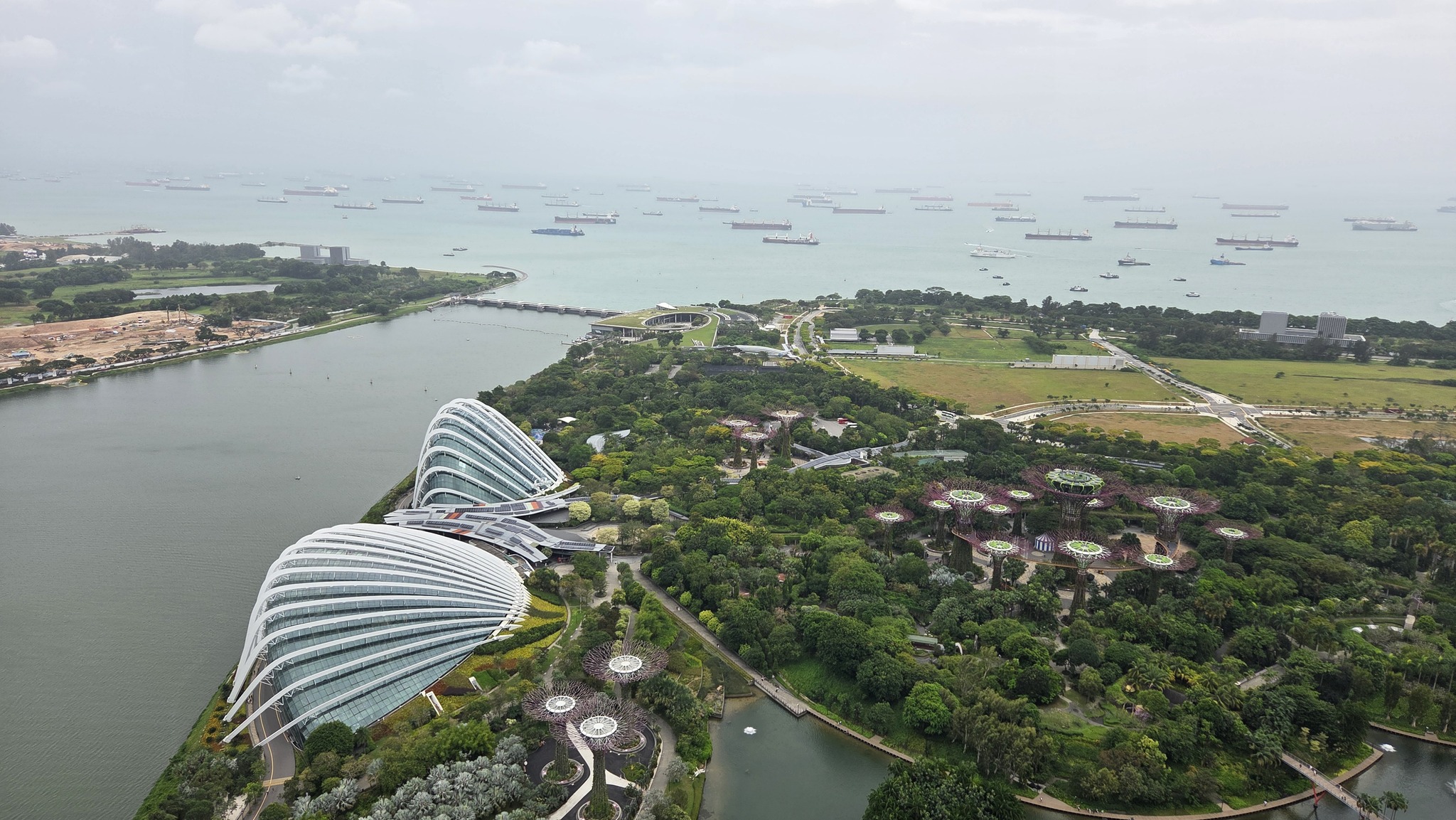 Вид на парк Gardens by the Bay и оранжереи Flower Dome и Cloud Forest со смотровой площадки (заодно можете оценить морской трафик - пожалуй, в Босфоре столько нет)