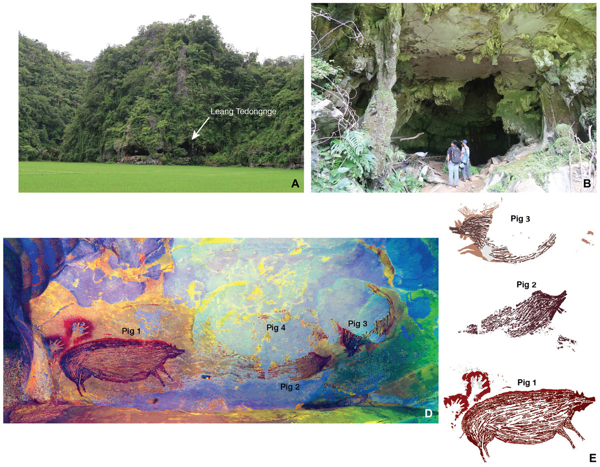 Пещера Леанг Тедонгнге и найденные в ней древнейшие рисунки — изображения сулавесских бородавчатых свиней (Sus celebensis). Изображение из обсуждаемой статьи в Science Advances
