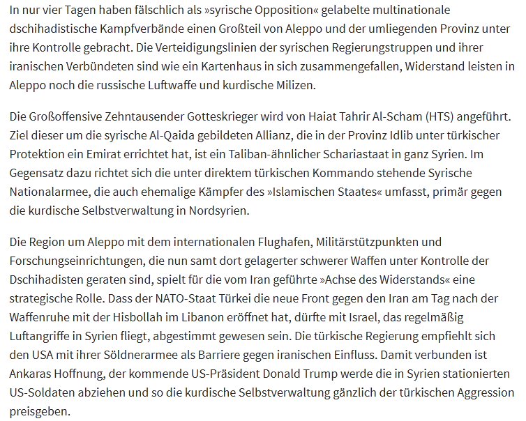 Регион вокруг Алеппо с его международным аэропортом, военными базами и исследовательскими центрами, которые теперь перешли под контроль джихадистов вместе с хранящимся там тяжелым вооружением, играет стратегическую роль для возглавляемой Ираном «оси сопротивления». То, что страна НАТО Турция открыла новый фронт против Ирана на следующий день после прекращения огня с «Хезболлой» в Ливане, вероятно, было согласовано с Израилем, который регулярно наносит авиаудары по Сирии. С помощью своей наемной армии турецкое правительство рекомендует США себя в качестве барьера против иранского влияния. Это связано с надеждой Анкары на то, что будущий президент США Дональд Трамп выведет американских солдат, размещенных в Сирии, и тем самым полностью оставит курдское самоуправление перед турецкой агрессией.
