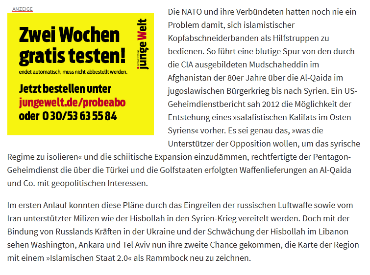 У НАТО и его союзников никогда не было проблем с использованием банд исламистских головорезов в качестве вспомогательных войск. Кровавый след ведет от обученных ЦРУ моджахедов в Афганистане в 1980-е годы к Аль-Каиде во время гражданской войны в Югославии и вплоть до Сирии. В докладе американской разведки в 2012 году предсказывалась возможность возникновения «салафитского халифата на востоке Сирии». Это именно «то, чего хотят сторонники оппозиции – изолировать сирийский режим» и обуздать шиитскую экспансию, – секретная служба Пентагона оправдывала поставки оружия «Аль-Каиде и Ко» через Турцию и страны Персидского залива геополитическими интересами.