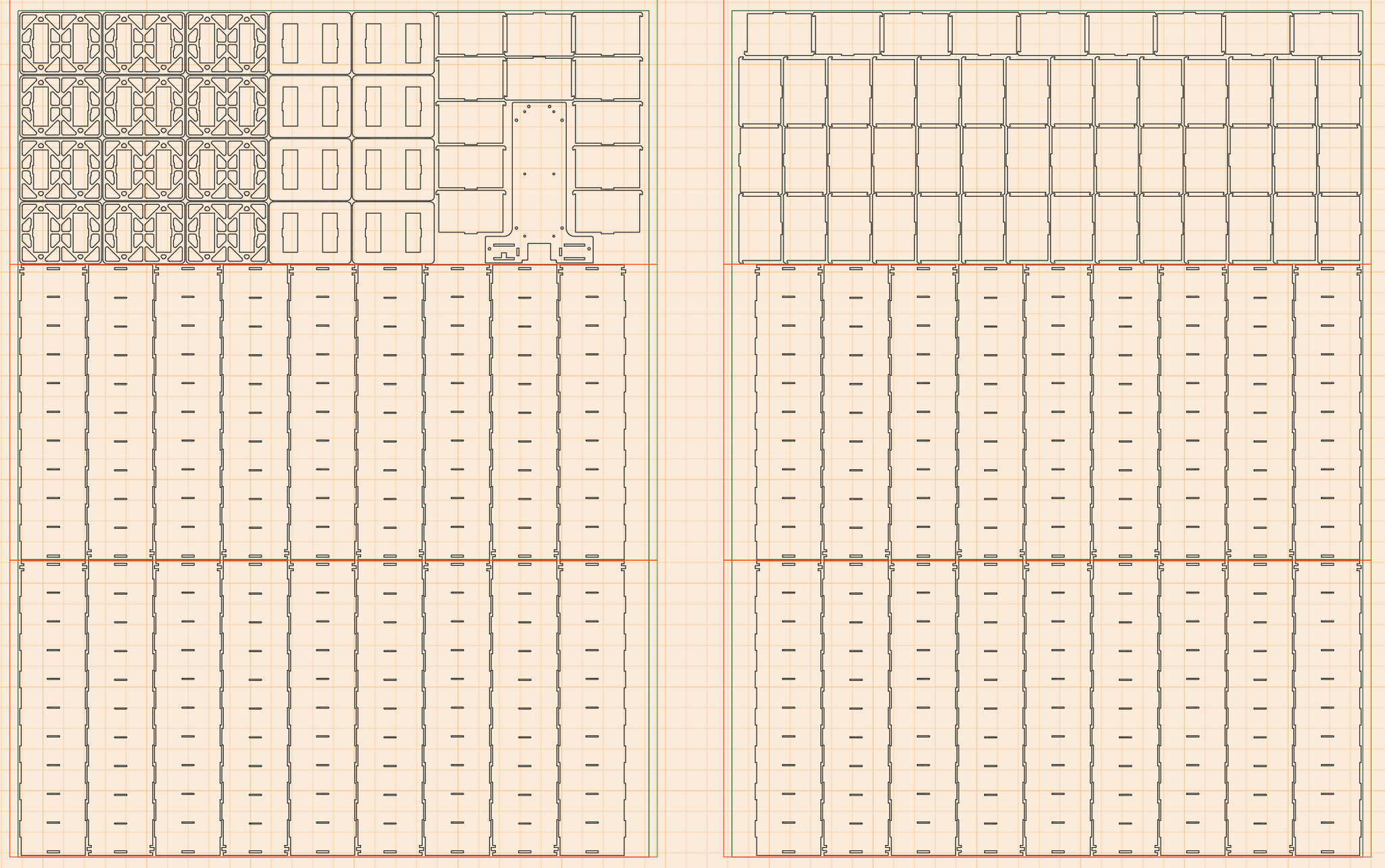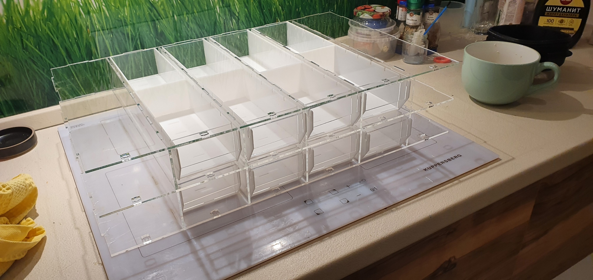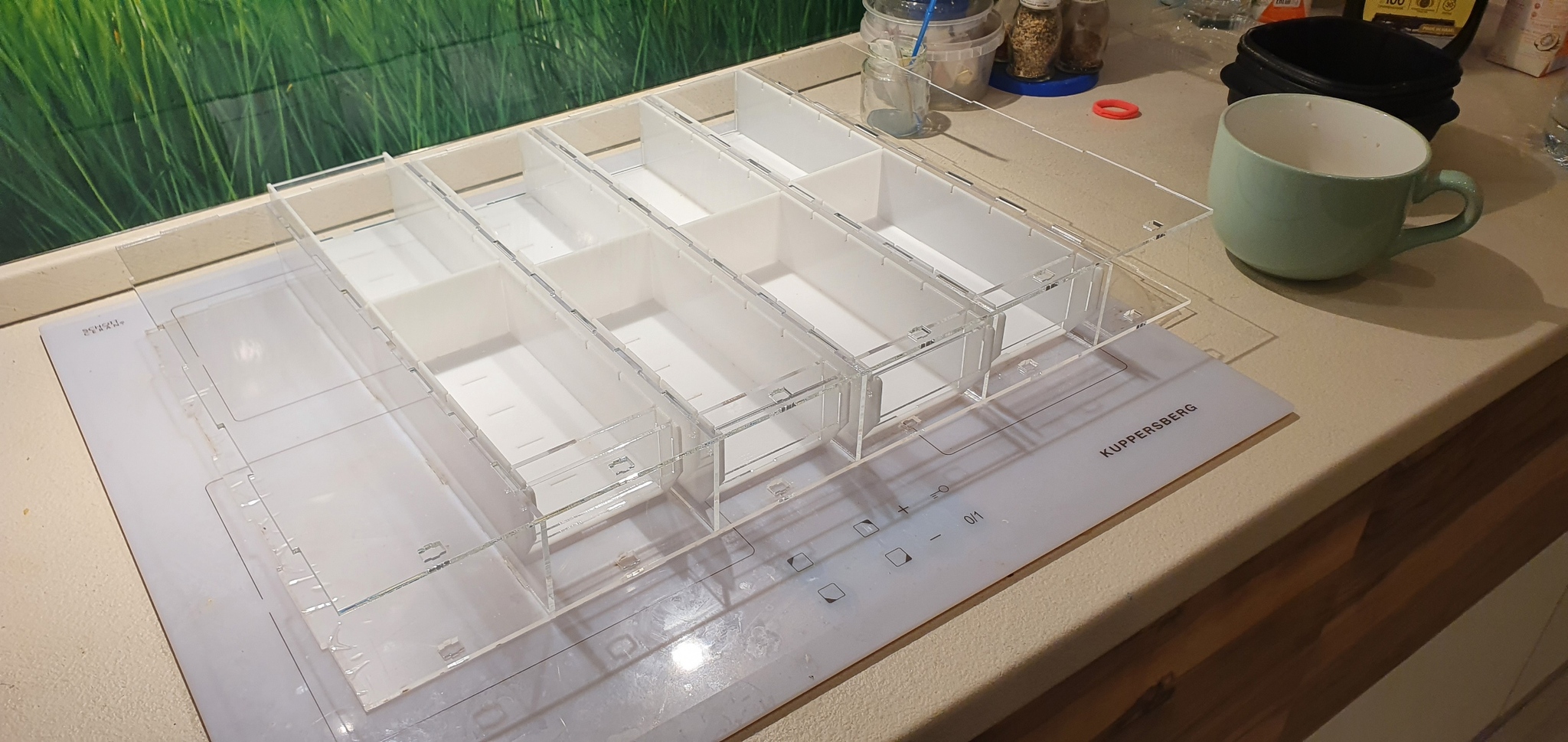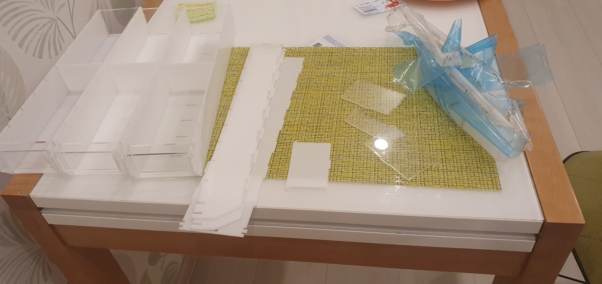 После успешного завершения и проверки модели, оставалось дождаться поездки домой, где я, наконец, смог снять размеры ячейки своего шкафчика и, решив, что толщина "толстых" деталей (сама кассетница и передние и задние стенки кассет) будет равна 3мм, а "тонких" (остальные части кассет) — 2мм, обновил модель, создал комплект раскроек для резки лазером в формате DXF и через отца вышел на его знакомого (Николай Михайлович, если вы это читаете — спасибо вам огромное!), который оказался готов нарезать мне все детали и подсказал, где купить желаемый материал (я хотел сделать всё из оргстекла, то есть полиакрилата).