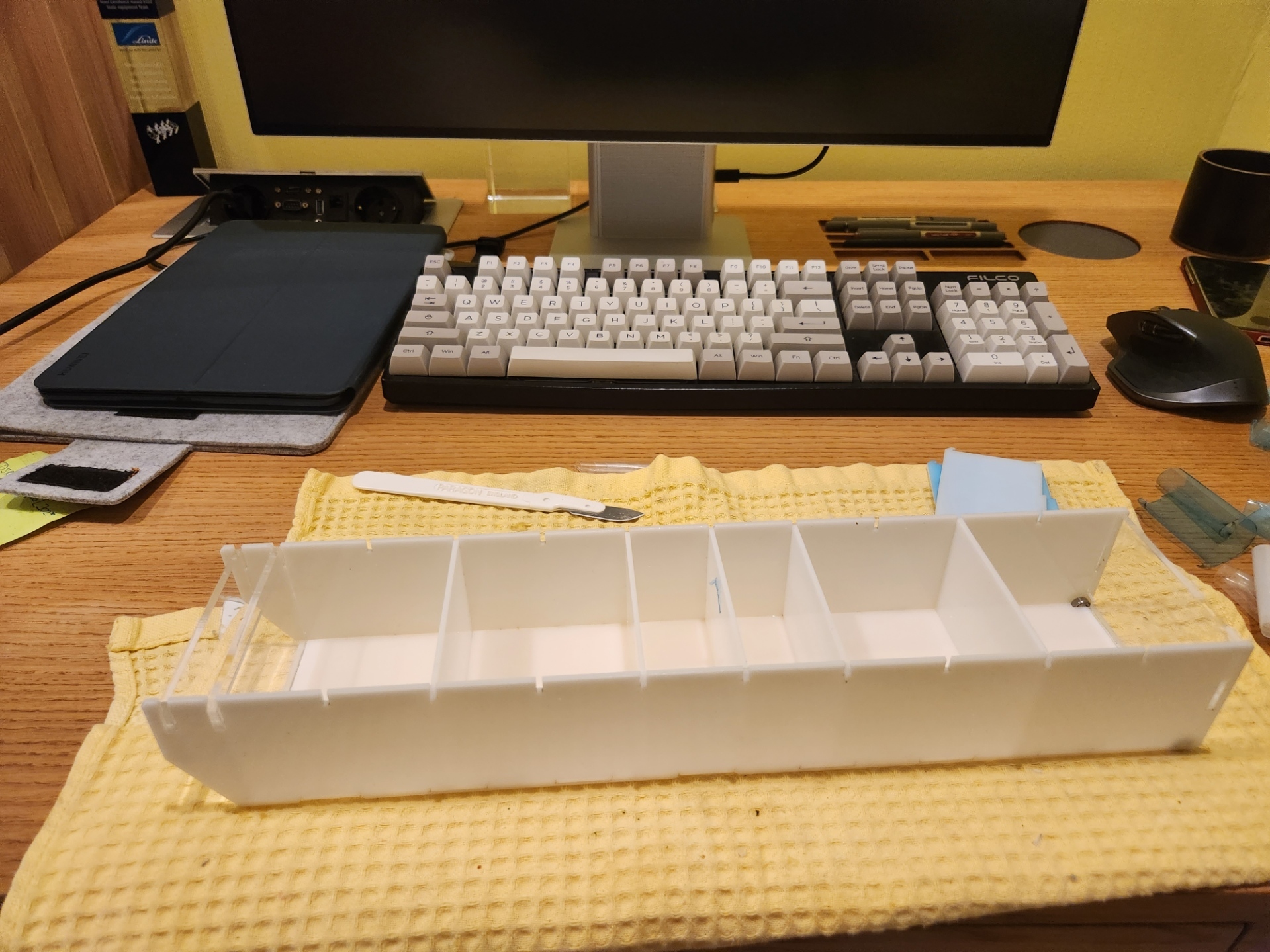 Ещё очень радует решение применять прозрачный пластик для передних панелей и ручек ящичков-кассет — благодаря этому (и группировке мелочёвки по ящикам) легко понять, что лежит в каждой секции и извлечь нужную кассету. Прозрачность междуэтажных перегородок кассетницы уже не так полезна, хотя видеть то, что лежит уровнем ниже извлечённой коробочки, тоже оказалось не вредным.