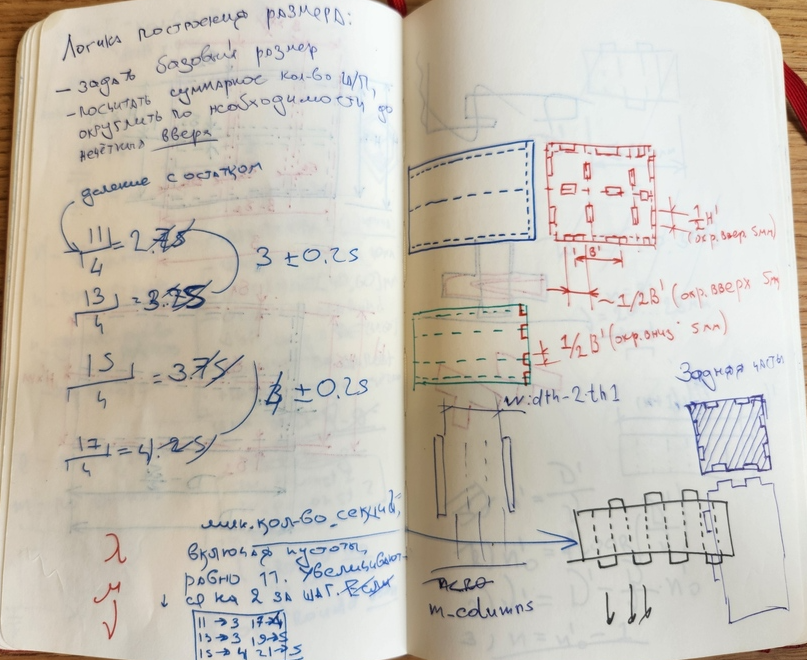 Сказано — сделано. Для начала я начеркал в скетчбуке пару набросков, чтобы лучше представить себе, как детали будут соединяться между собой и как примерно должны вычисляться их размеры: