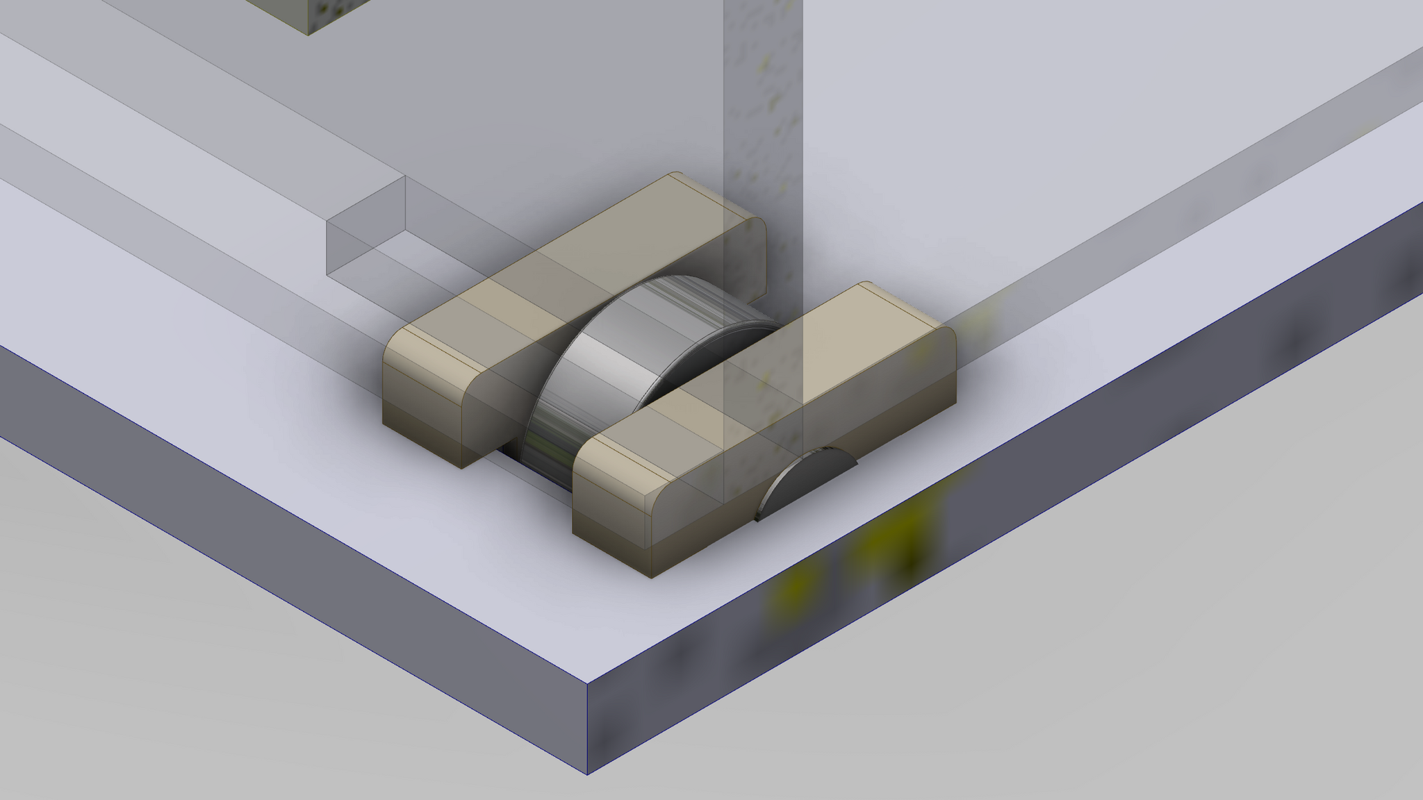 Выглядит это в модели так (часть модели правее катка отсечена для удобства просмотра), при этом и колёсиков (в их качестве применил подшипники 8x4x3 с алиэкспресса) нужно на четверть меньше, и в работу все они включены вплоть до момента полного извлечения кассеты из ячейки.