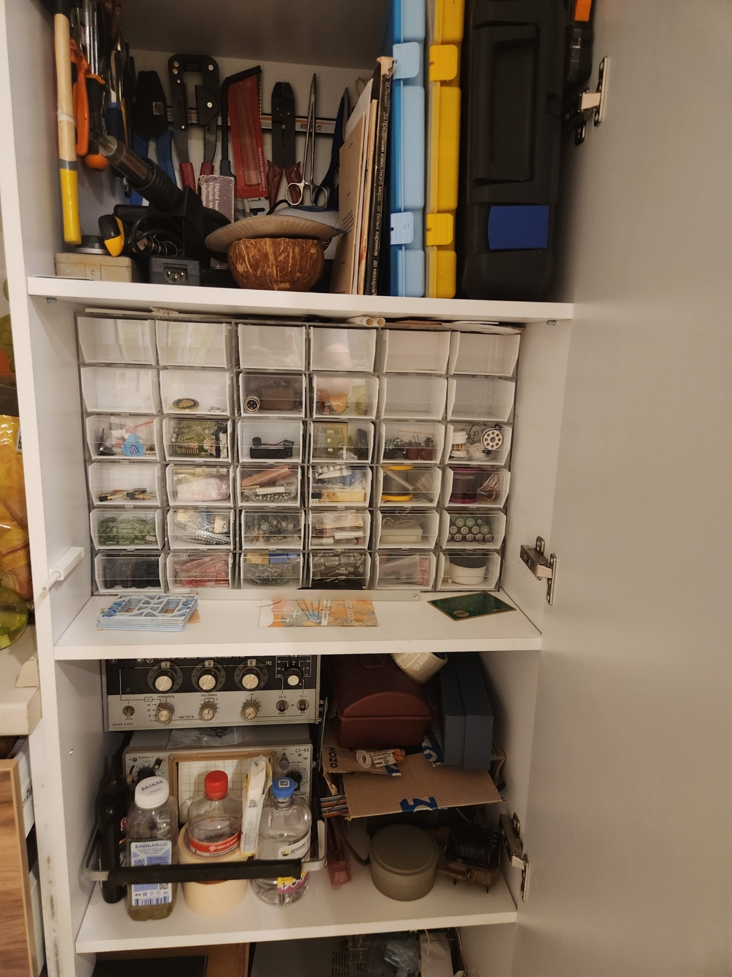 Результат полностью оправдал и даже превзошёл мои ожидания. Я очень жалею, что не могу показать фото того, как было "до", но, для понимания ситуации — приборы с полки ниже смогли переехать на неё с балкона, а самая верхняя полка была полностью отдана папкам с моими архивами и книгам благодаря массе освободившегося в шкафу места, а ведь из 36 коробочек полностью не заполнена даже половина! Это, кстати, и даёт ответ на вопрос — почему бы не использовать куда более дешёвые стандартные системы хранения? Дело именно в том, что их размеры не вполне соответствуют конкретной полке, а глубина каждой кассеты — в разы меньше, чем у моих, поэтому и эффекта от их применения тоже было бы куда меньше.