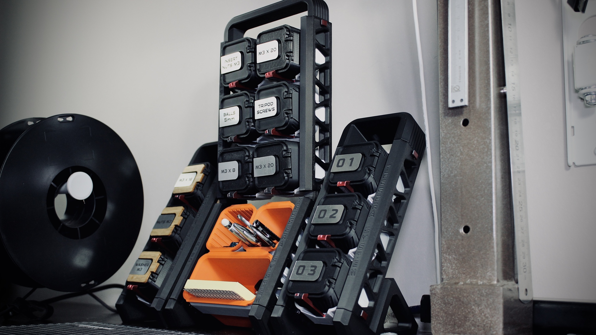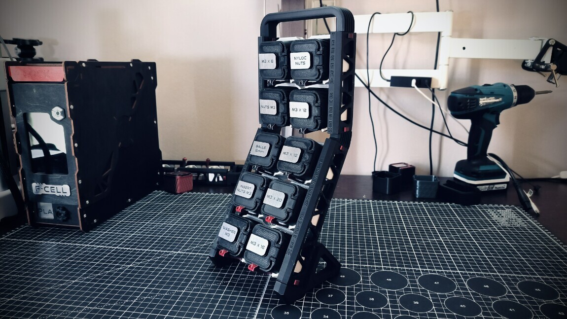 Я сознательно отказался от внешних креплений. Вся система строится только из напечатанных деталей. Нет покупных рейлингов, стеллажей, или полок.
