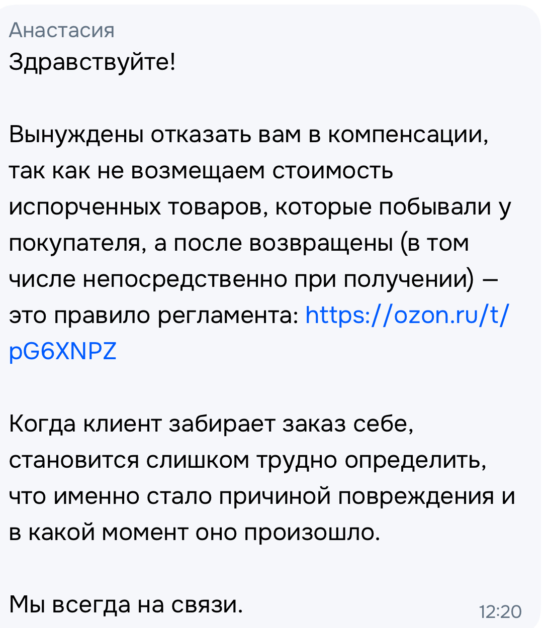 1. Невозможность оспаривания: Политика Ozon в ее текущей трактовке полностью снимает с платформы ответственность за любые манипуляции с товаром в момент «вскрытия и отказа» в ПВЗ.