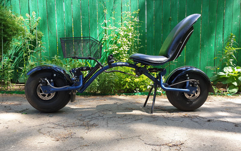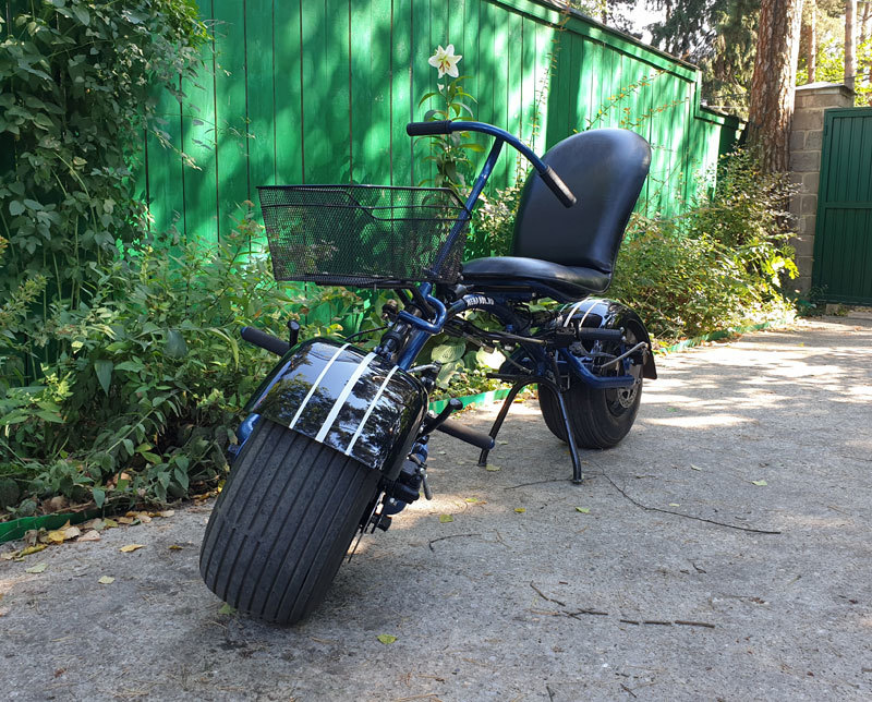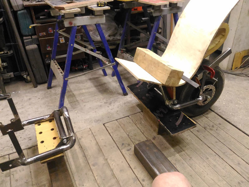 Давно хотел попробовать сделать двухколесный аппарат с креслом. А заодно пробовать ножное управление направлением, газом и тормозом. Оказалось что управлять ногами не так просто. Дело в том, что когда рулишь руками, ноги при этом упираются в противоположную сторону. Это особенно заметно когда у тебя на руле лежат и руки, и ноги. Нужно приучить организм проворачивать ноги в ту же сторону. Под сиденьем у аппарата есть руль со своим комплектом газа и тормоза. В конце решил добавить и руль в обычном месте, для новичков. Этот руль может устанавливаться по желанию и откидывается вперед, если при дтп придется улететь через руль.