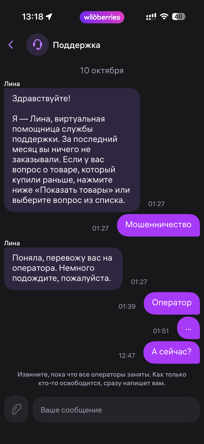 При пополнении просит перевести фиксированную сумму на карту Wildberries - а после пополнения сервис сообщает что в первую очередь обрабатывает только крупные платежи и просит доплатить. Никаких чеков и прочего естественно нет. То что это с высокой долей вероятности скам - понятно было и так, по этому для теста и была закинута минимальная сумма в 500р. Но в данной ситуации интересно не это, решил я значит связаться с поддержкой "Банка" Wildberries и предоставить все данные, о том что - некая Антонина Федотовна П. с номером +79187996560 ведет мошенническую деятельность посредством их "Банка". Написал я в техподдержку в час ночи а пост этот пишу в час дня следующего дня - свободный специалист до сих пор не нашелся :D