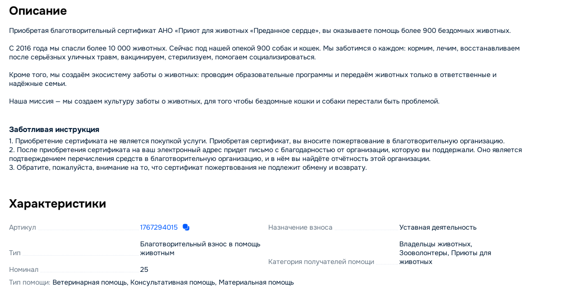 И вот, прошло 6 лет, и сегодня, зайдя на Озон за какой-то мелочёвкой, я вижу следующую картину: "Преданное сердце" продаёт сертификаты на "помощь животным". Естественно, никакой отчётности у приюта перед жертвующими деньги нет.