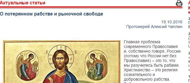 «Главная проблема современного Православия и, собственно говоря, России (потому что России нет без Православия) – это то, что мы разучились быть рабами. Христианство – это религия сознательного и добровольного рабства. Рабская психология – это не какой-то скрытый подтекст, а норма мироощущения для православного христианина. Все современное общество поклоняется идолу социальных прав и свобод. И только Православная Церковь упорно утверждает, что человек – это бесправный раб Божий. Поэтому так неуютно себя чувствует современный «свободомыслящий» человек в православном храме, где все проникнуто архаикой рабства», – пишет служитель культа.