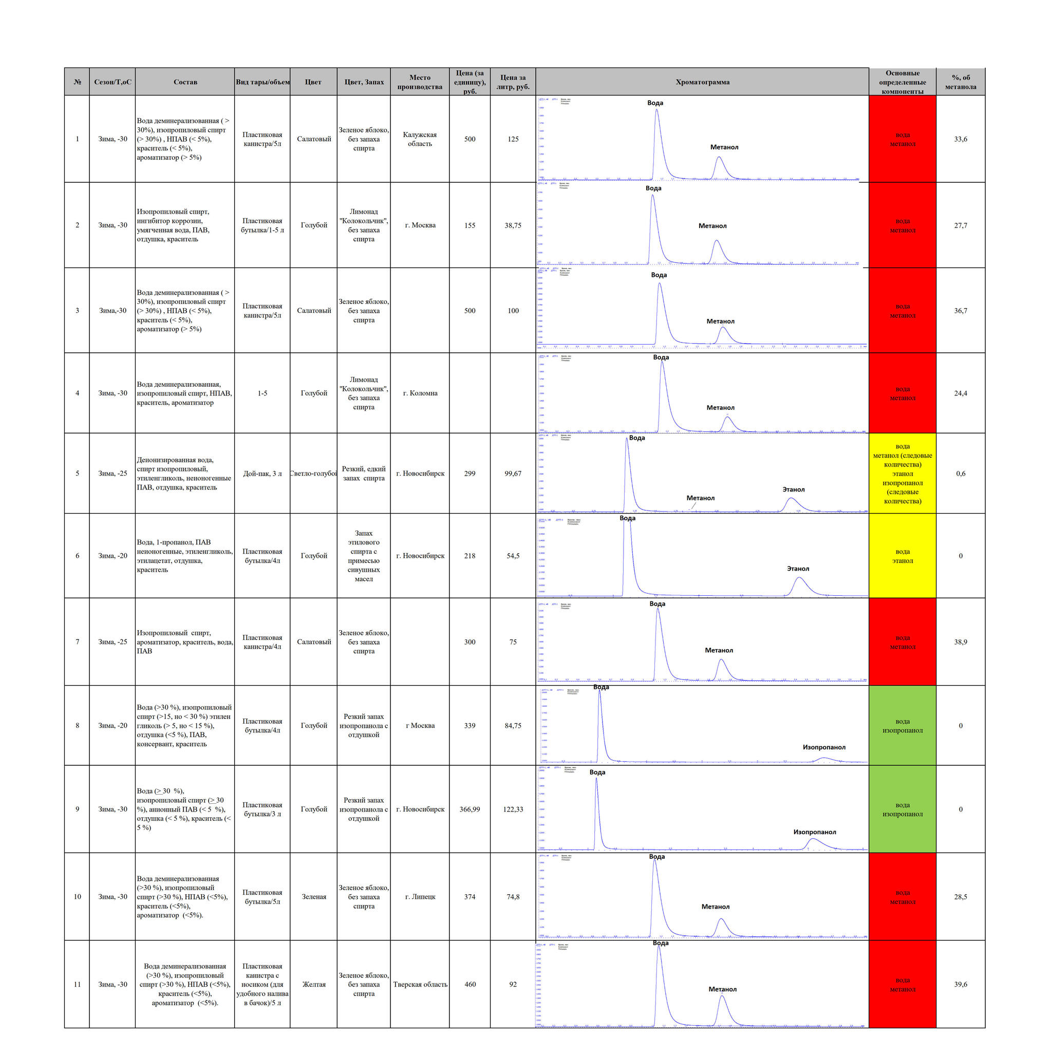 Если кратко, то: практически во всех этих жидкостях в качестве основного незамерзающего компонента заявлен изопропанол, а по факту он был обнаружен только в 3 образцах. Причем в одном образце в следовых количествах.