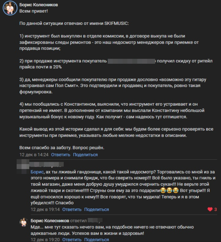 Борис активно ведет страницу в ВК и вполне активно отвечает на различные посты и претензии, где упоминается его магазин. Все скрины, которые я предоставлю ниже, были взяты из довольно активной и популярной в среде музыкантов группы Гас клаб, либо с официальных страниц Бориса и самого магазина.