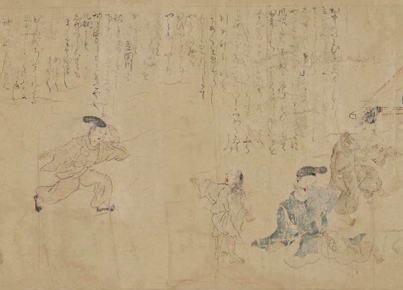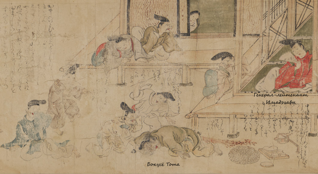 Наконец его схавитили за шапку эбоси и за волосы и вышвырнули из сада. С головы его ручьями стекала кровь, словно багровая осенняя река Тацута.