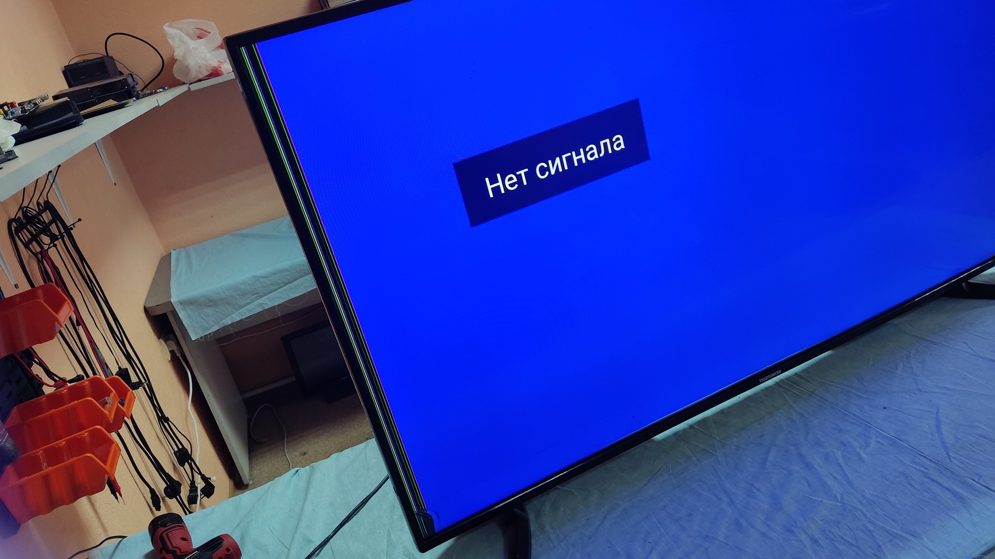 Итогом ремонта стало то, что заменив вспухшие конденсаторы, мы пересобрали телевизор как положено и получили результат, который виден на первом фото. Половина экрана заплыла черным пятном, а от нижнего угла, где была трещина, вверх пролегли разноцветные полосы. После разъяснения ситуации клиенту, мы решили попробовать частично восстановить изображение и оторвали боковые шлейфы матрицы, которые замкнуло из-за трещины. Итогом стало то, что чернота пропала.