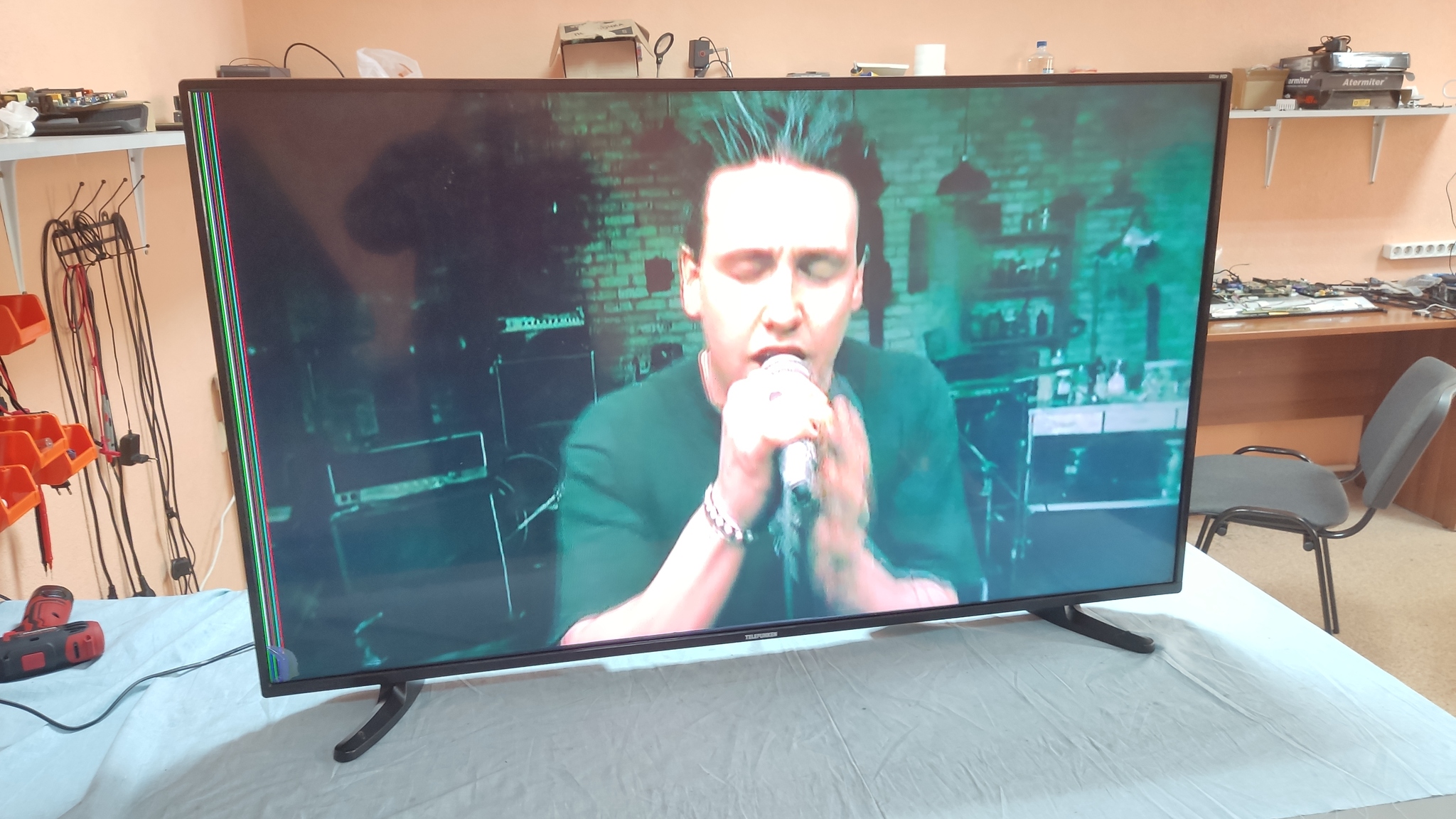 Черноту убрать удалось, но вот заживить матрицу, увы, невозможно. Однако, клиент остался доволен, что детям будет на чем смотреть мультики, им эта полоса слева не так важна, как Три кота, Свинка Пеппа и Смешарики.