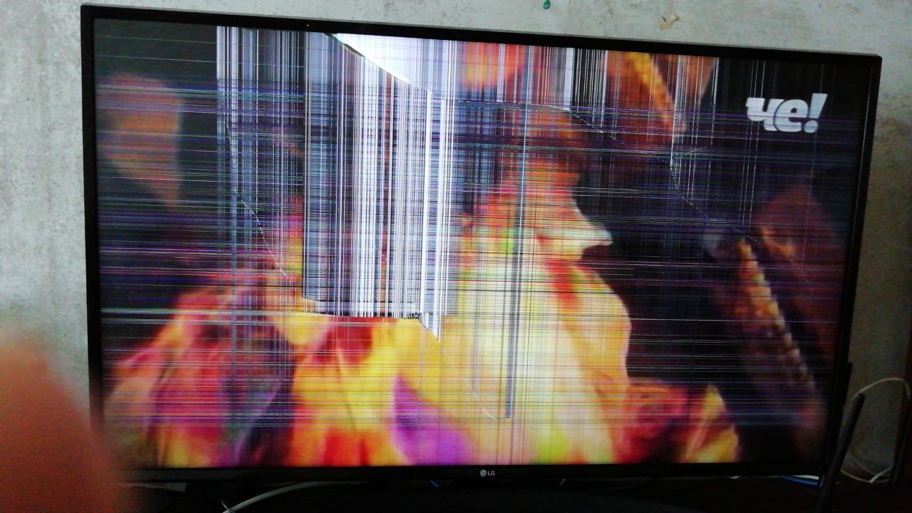 Итогом ремонта стало то, что заменив вспухшие конденсаторы, мы пересобрали телевизор как положено и получили результат, который виден на первом фото. Половина экрана заплыла черным пятном, а от нижнего угла, где была трещина, вверх пролегли разноцветные полосы. После разъяснения ситуации клиенту, мы решили попробовать частично восстановить изображение и оторвали боковые шлейфы матрицы, которые замкнуло из-за трещины. Итогом стало то, что чернота пропала.