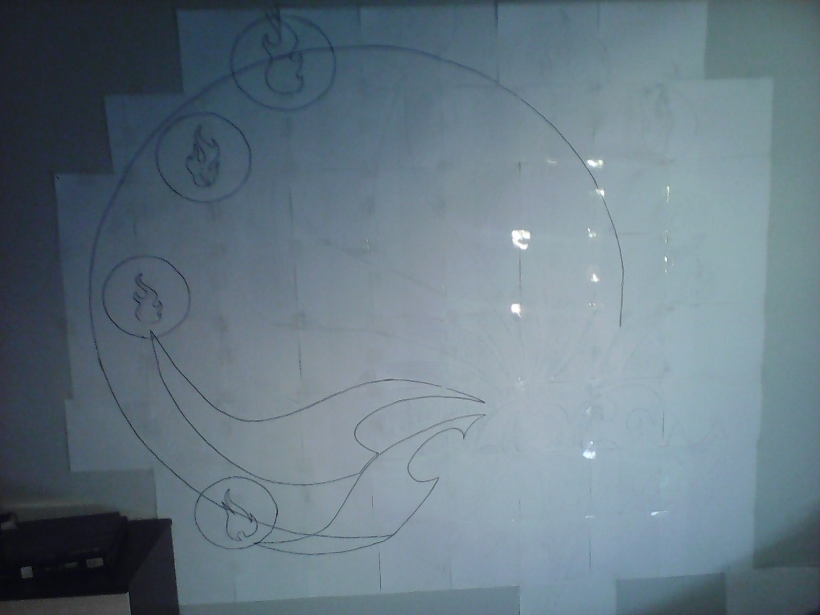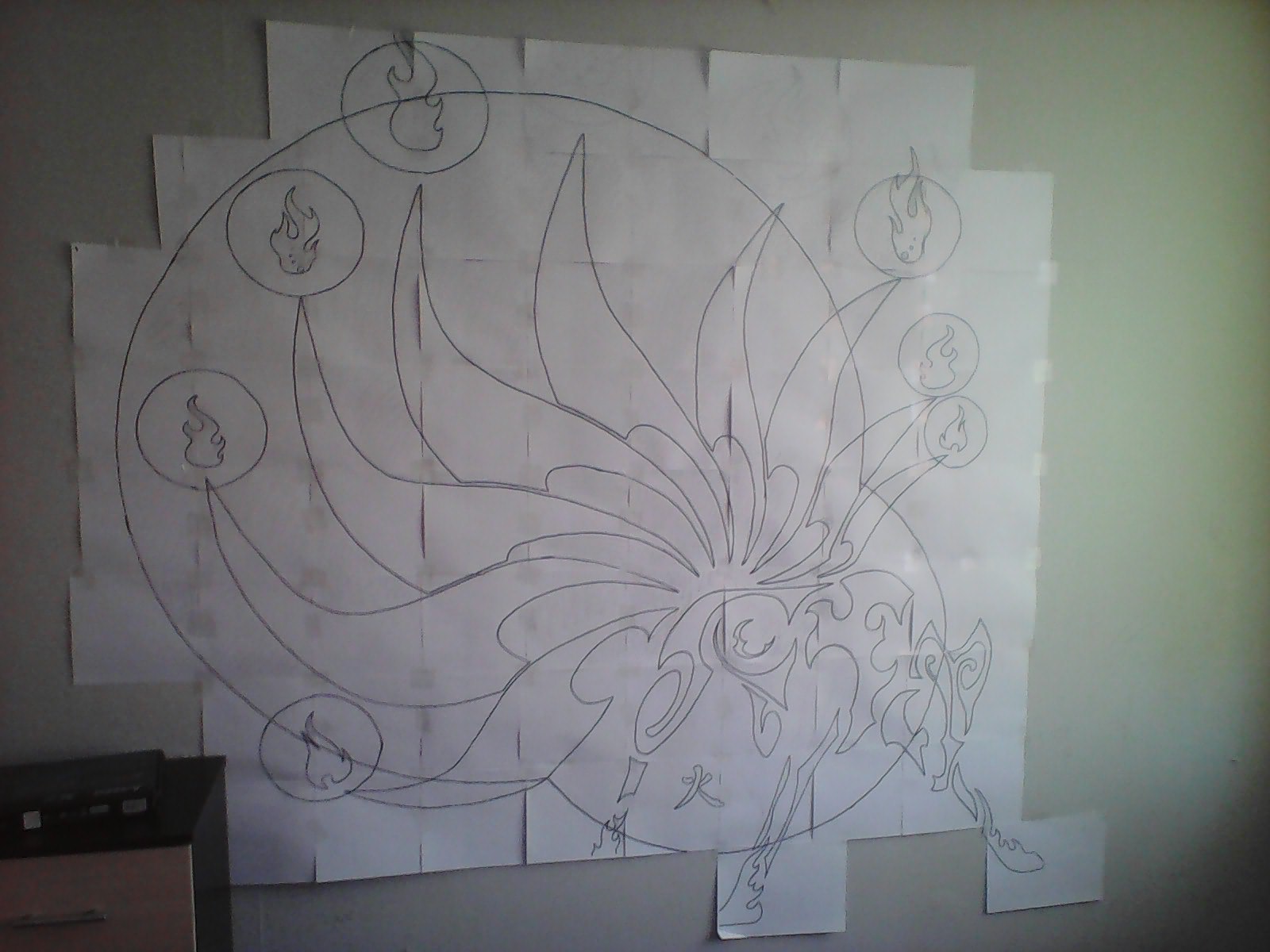 Решено было рисовать вручную.Слепил огромный лист, прилепил на стену и вперед. Сначала карандаш, потом обычный черный маркер: