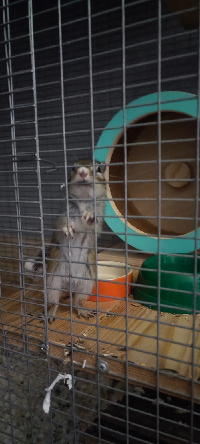 Ну а в целом, что могу сказать. Животина классная. Красивая. Ночная, правда, и очень подвижная. Спасает колесо деревянное, изнутри пробкой обитое. Тихо, ему удобно и в кайф, гоняет постоянно в том колесе. А также иногда в нём спит, иногда ест) С интересом наблюдает за всеми крысами во всех клетках. Крыс он уже нормально перевидал на своём веку. Ест в основном семечки, орешки, обожает расколупывать кедровые шишки. Ну и всякие зëрнышки, хрустяшки уважает. Корм для бурундуков продаётся, плюс в дар принимает охотно пару "сердечек" крысиного "Версель-Лага".