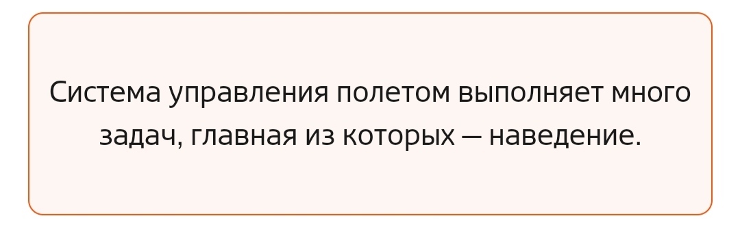 Так называется совмещение траектории полета с точкой цели. Навигационный сегмент системы управления содержит инерциальный измерительный блок. В его основе три акселерометра — прибора, непрерывно и точно измеряющих текущие ускорения по трем перпендикулярных пространственным осям. Интеграторы превращают ускорения в скорости по трем осям, а после двукратного интегрирования — в три координаты в пространстве. Так инерциальный блок системы управления знает текущую пространственную скорость ракеты, ее величину и направление в пространстве, а также текущие координаты ракеты. Угловое положение ракеты в пространстве измеряется с помощью гироскопов.