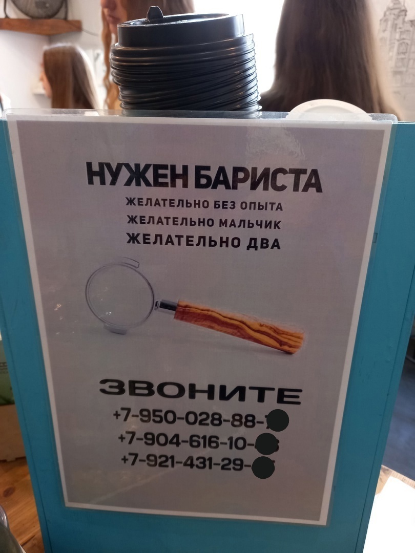 23 Lee222 1 год назад Специфический юмор Скажите триста1 Санкт-Петербург Кафе Бариста Смешные объявления Вакансии Объявление Фотография 1 1 Ещё 0