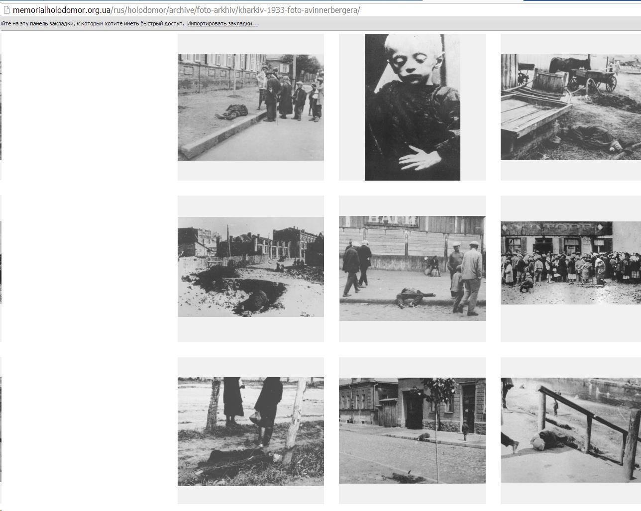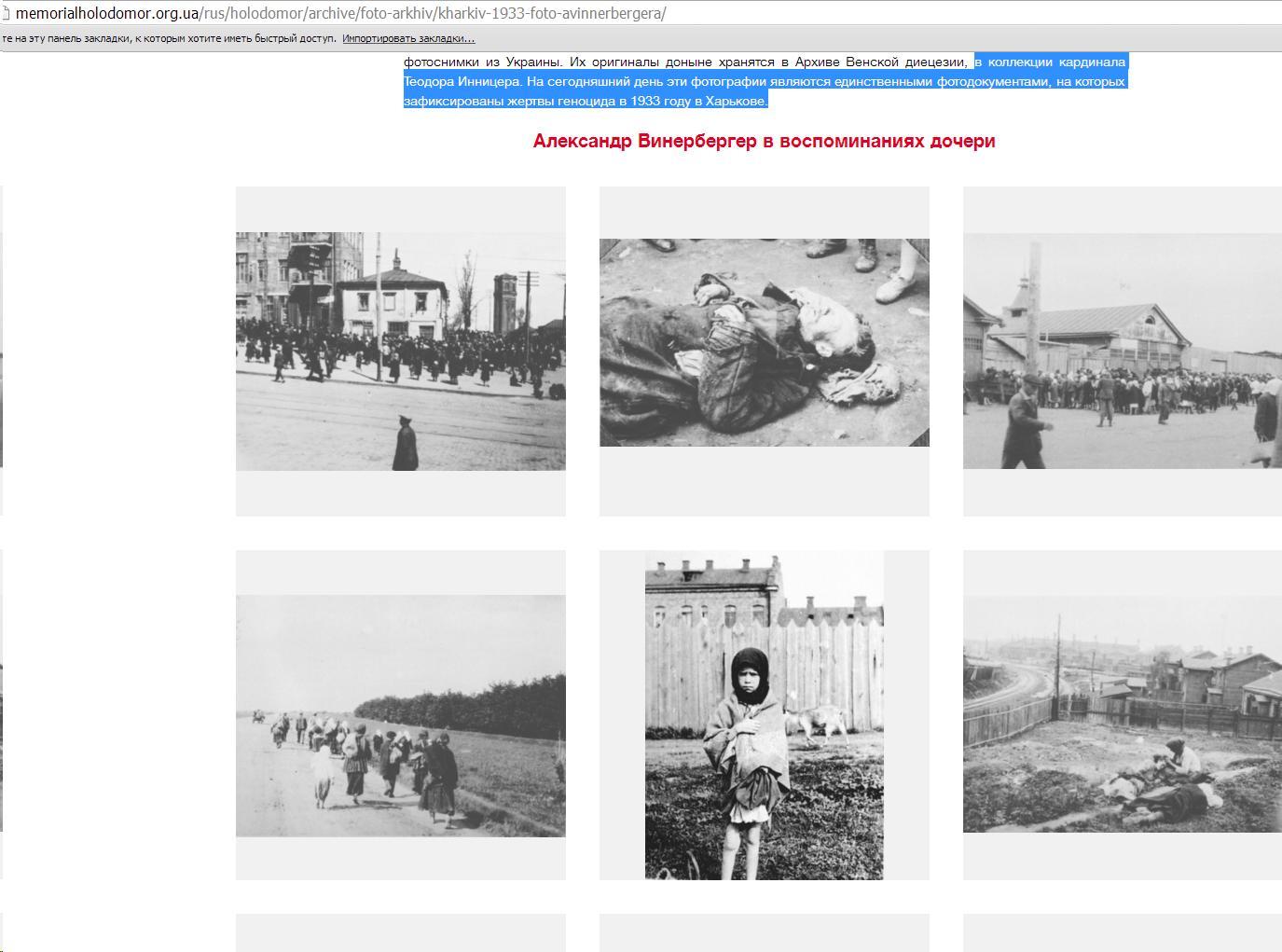 Как я уже говорил, вся фотодокументальная база голодомора - это двадцать шесть снимков австрийского инженера Александра Винербергераhttp://resource.history.ХХХ.ua/item/0014332 (всесто ХХХ вставляем org)