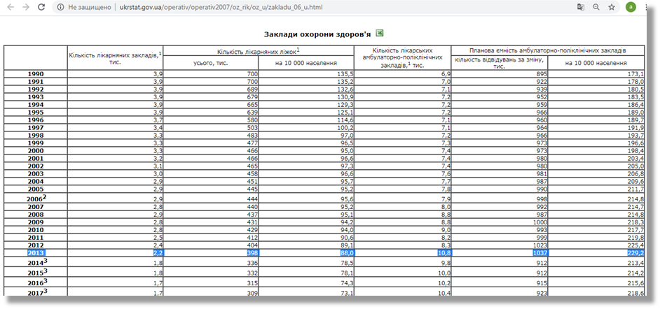 Количество больничных учреждений снизилось с 3,9 тысячи в 1990 году до 2,2 тысячи в 2013 году. А количество больничных коек снизилось с 700 тысяч в 1990 году до 398 тысяч в 2013.
