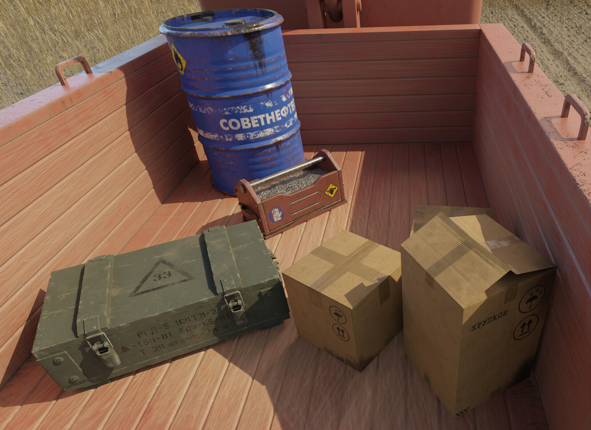 Попробовал сделать работу по концепт-арту одного художника, Андрея Ткаченко, под названием "Сказки старого грузовика". Очень понравился данный арт свой идеей альтернативной истории, поэтому захотелось воплотить его в 3D. Впервые я пробовал моделировать персонажа - робота, до этого только техника и предметы. Так же в данной работе открыл для себя геоноды, сажал рож и траву, раскидал камни, правда ПК слабоват оказался :) Ну и по софту - моделил в blender, запекал в Marmoset, текстурил в Substance Painter. Модельки gameready, грузовик - 71,2к треугольников, робот - 16,3к треугольников, ящик для гранат 3,5к, бочка - 1,5к, ящик с инструментами - 1,3к, ну а коробки с десяток полигонов, а водятлы не мои)