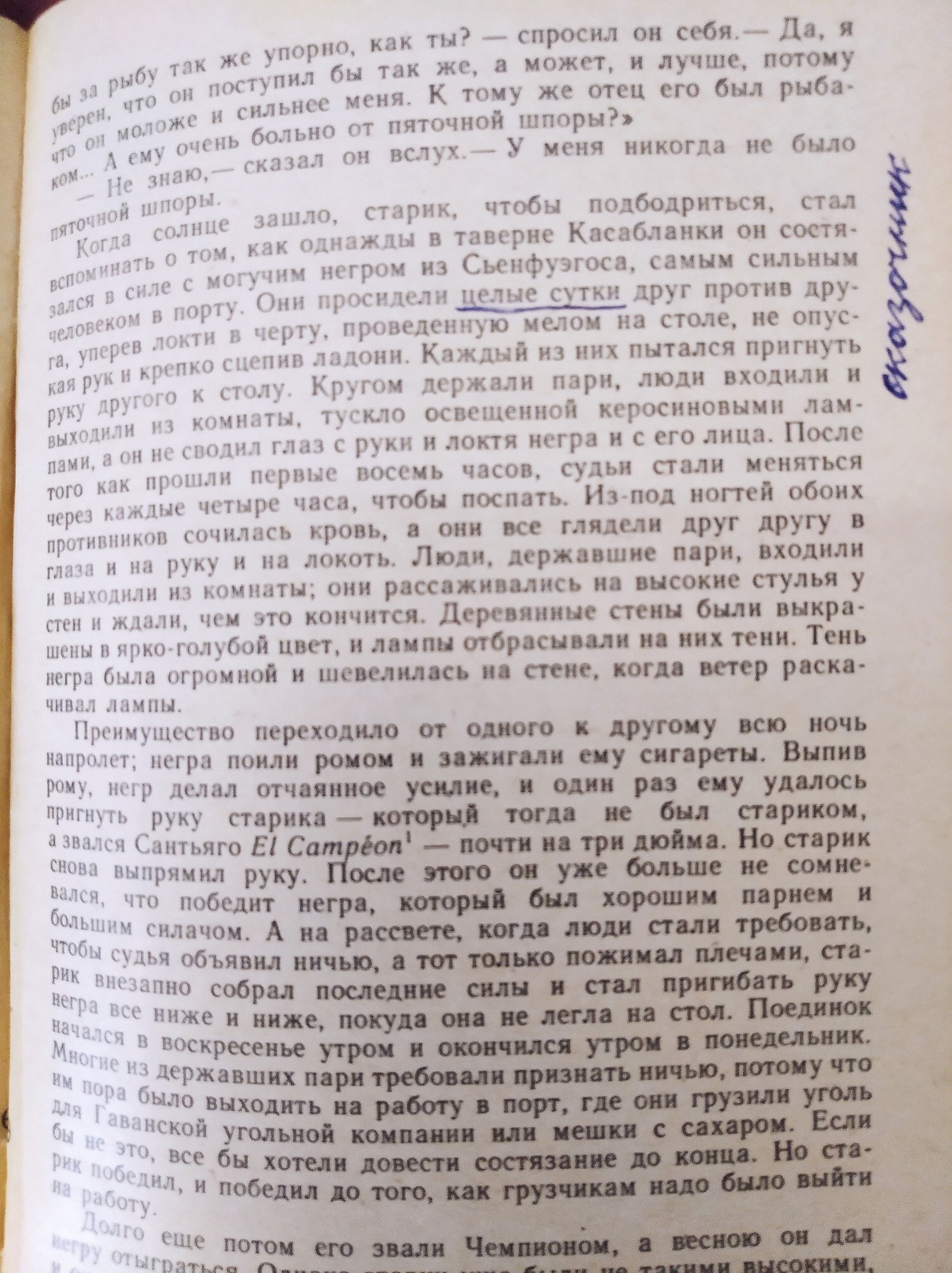 Недавно прочитал повесть ,,Старик и море".Произведение в целом понравилось, но обнаружил в нём ,,ложку дёгтя".Это сцена из далёкой молодости главного героя, старика Сантьяго, где он в отчаянно-упорной схватке на руках одержал над соперником волевую победу.А длилось их противостояние...целые сутки.Без перерывов на отдых.Очевидно, что это из области фантастики.Страдавшему расстройством психики Хемингуэю можно простить такое буйство фантазии, но большой вопрос к редакторам и Нобелевскому комитету, вручившему писателю премию как раз за это самое произведение.В книге я спорное место подчеркнул и на поле сделал заметку ,,сказочник".