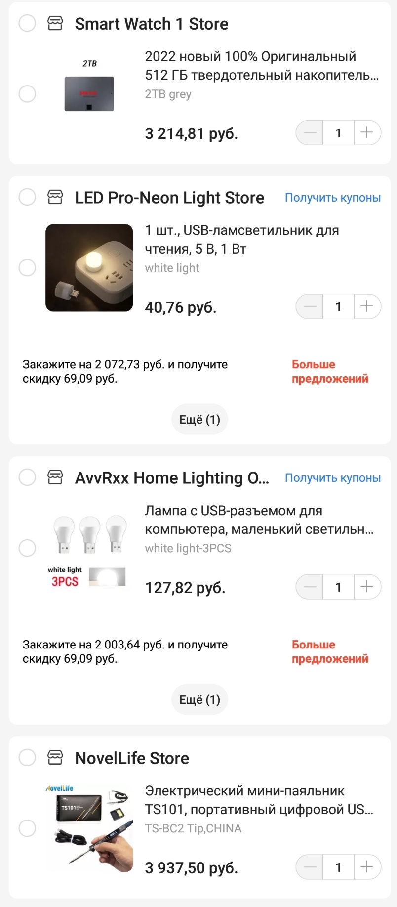 И так, имеем два приложения алиэкспресс. Одно от али, второе от мэйл. Приложение от али, старое, скидок не даёт, распродаж не отображает. А вот в новом приложении от мэйл.ру масса скидок и распродаж. Предлагаю сравнить корзины: