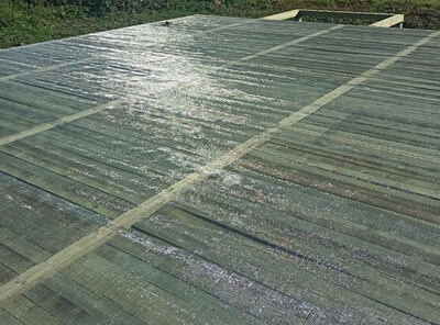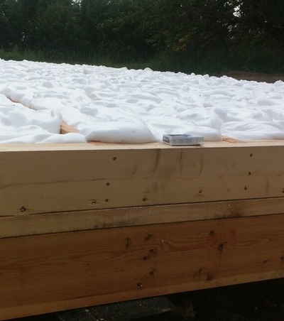 Затем по нему раскатывается противомышиная сетка, поверх которой раскатывается гидроветрозащитная мембрана. Процессы занимают у бригады полчаса. Результат - полностью ровная и защищённая платформа, готовая к сборке перекрытия: