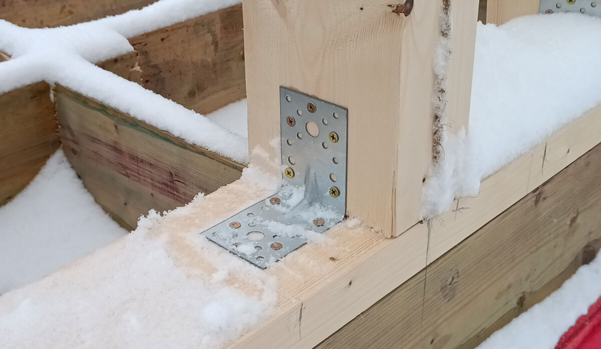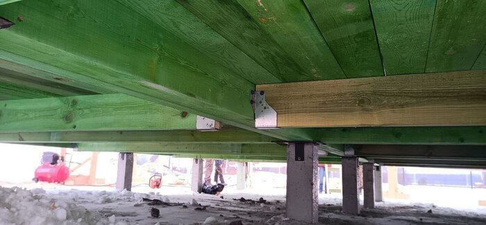 Черновые полы опираются на черепные бруски, в U-кронштейны установленны временные балки, которые создают необходимую для удержания человека жёсткость. После окончания строительства их можно демонтировать, но мы их оставляем как дополнительную опору. На таких полах утеплитель не провиснет, не отойдёт от краёв лаг, не просядет и не упадёт вниз. Противомышиные сетки и гидроветрозащита на таких полах также не прогнутся, не порвутся и будут лежать ровными полотнами, предохраняя дом снизу.