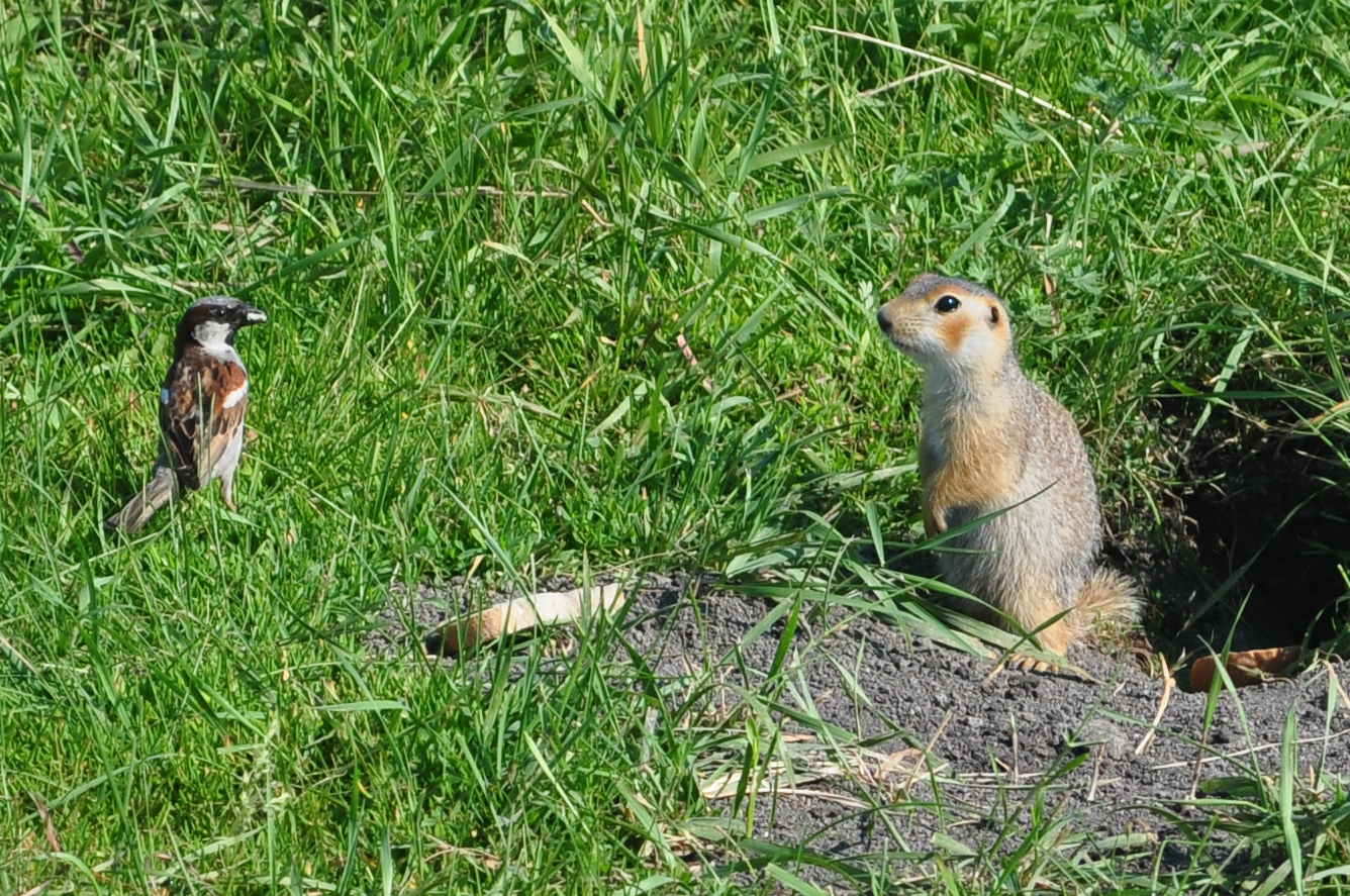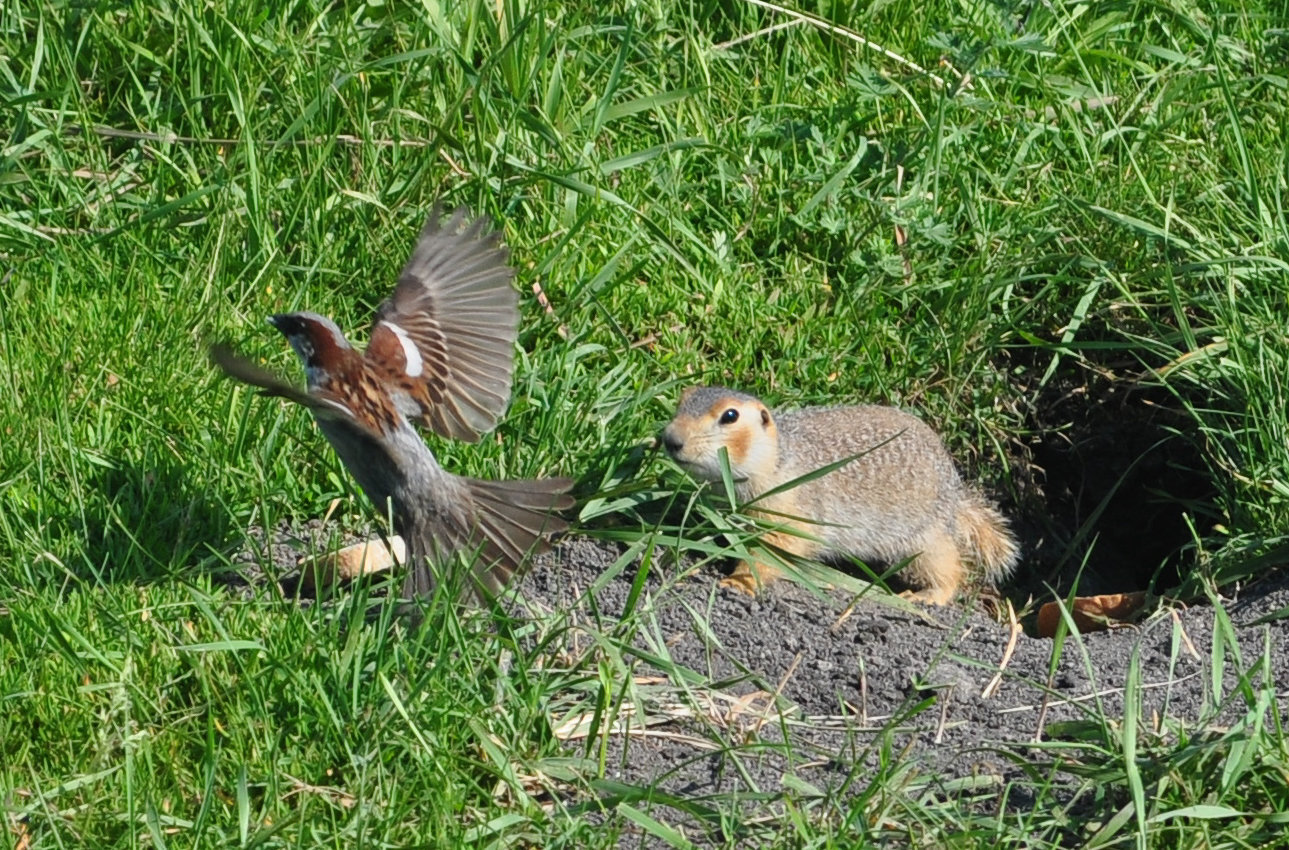 Естественно, что суслику такая наглость не понравилась. Сначала они просто играли с воробьем в гляделки. Затем терпение суслика лопнуло и он прогнал птичку.