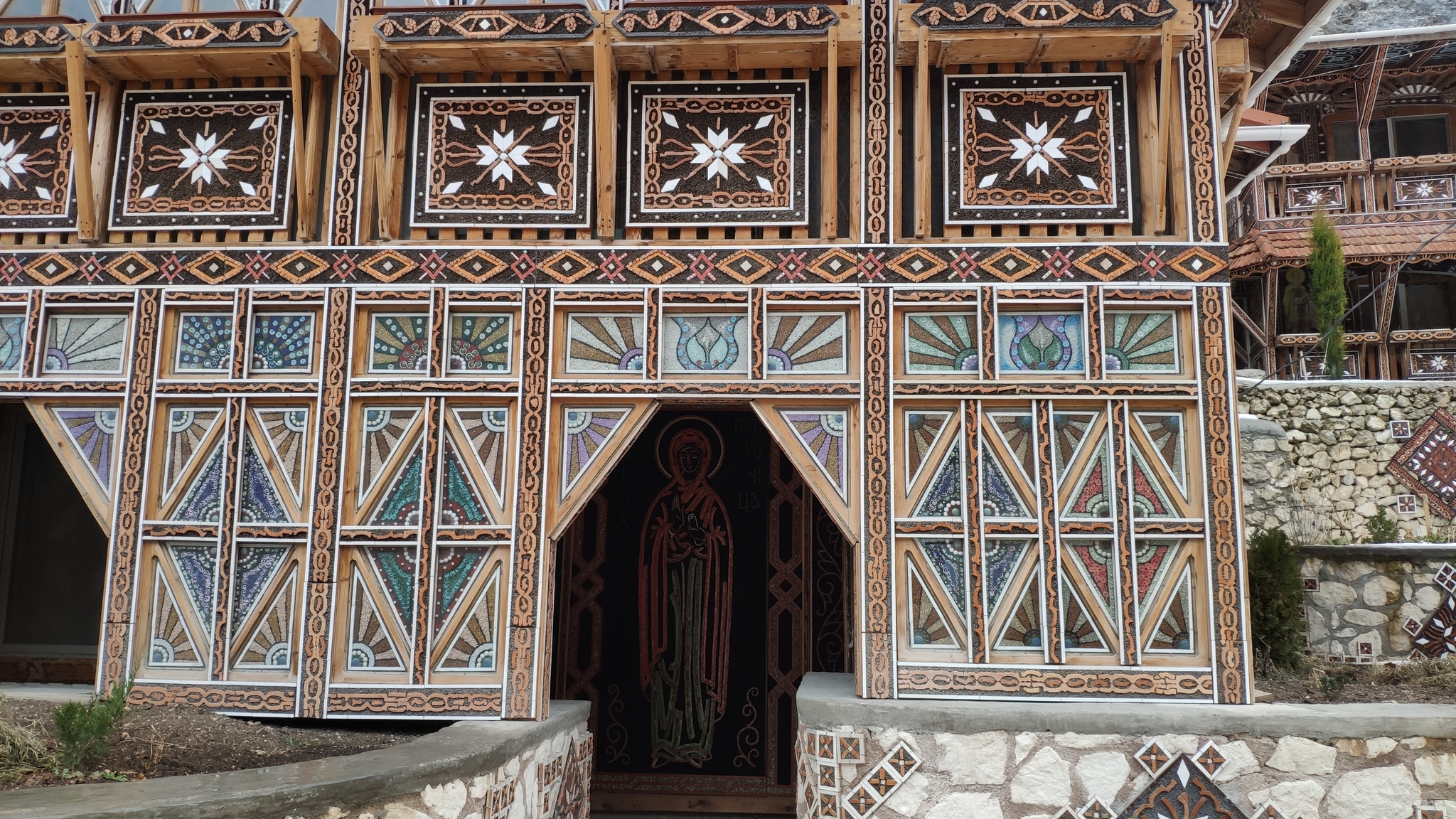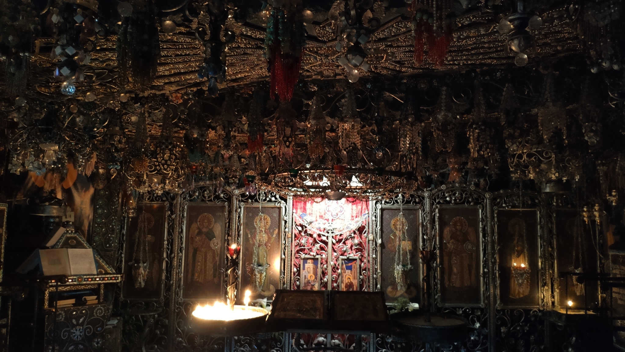 Традиционным способом с помощью краски расписать храм не удавалось, т.к. он расположен в скале, где довольно сыро, а известняк легко крошится. Было принято неординарное решение - использовать бисер, цветное стекло. Из этих материалов выполнены иконы храма, им же украшены многочисленные лампады. Постепенно в этой технике оформляли стены зданий, которые множились вокруг храма.