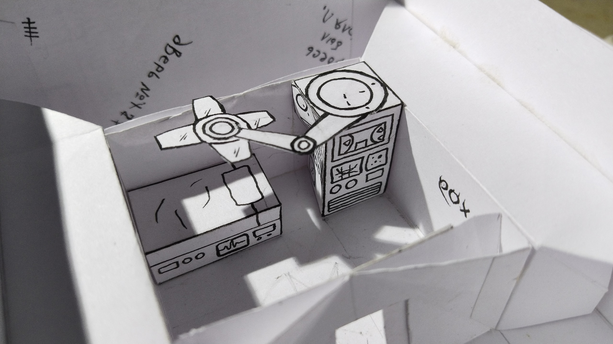 Каждый складной тайл имеет свою уникальную фишку. Где-то это круглая бочка посреди пространства, где-то - припаркованное НЛО, а в предыдущем вообще холодильник с открывающейся дверцей.